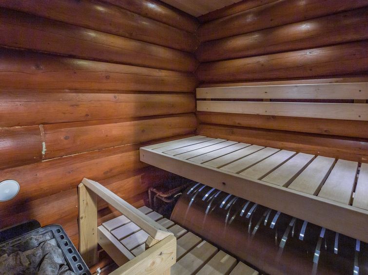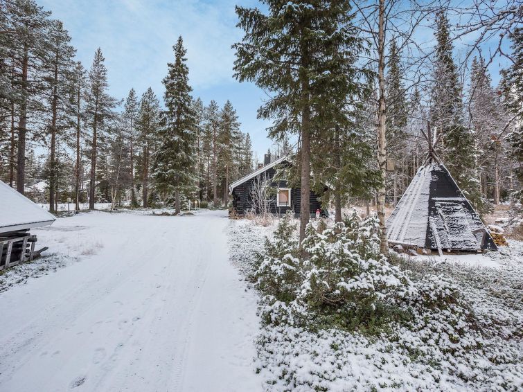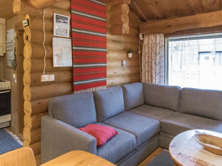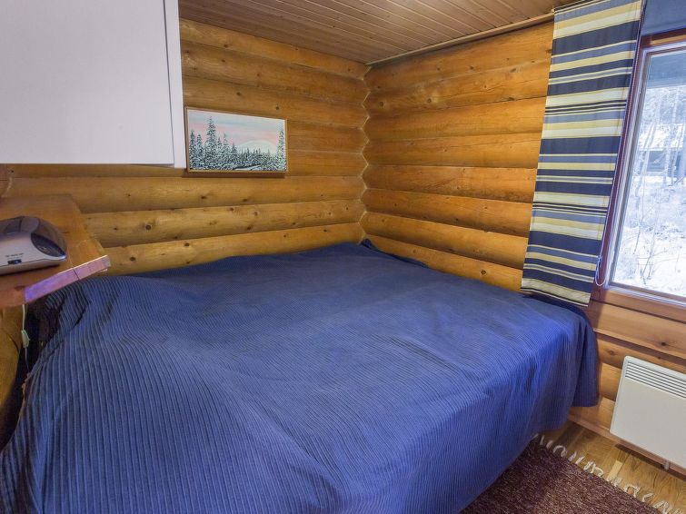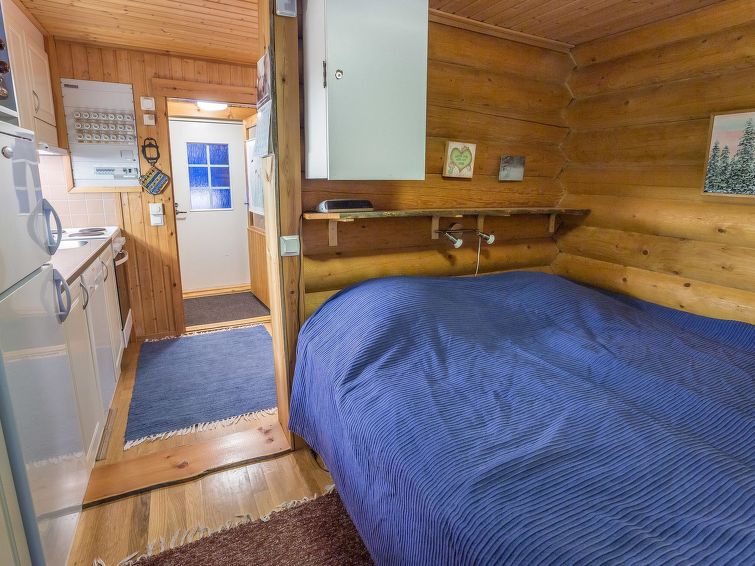 40 km north of Kolari, lake Äkäslompolo 400 m, swimming beach 900 m. Log rowhouse apartment 1988. Combined livingroom/kitchen with sofa bed, bedroom: double bed, sauna (electric), bathroom/toilet. Ski service room. Apartment doors height of only 180 cm, the height of the apartment in some places lower than normal. Loft is not suitable for accommodation because of lack of emergency exit.