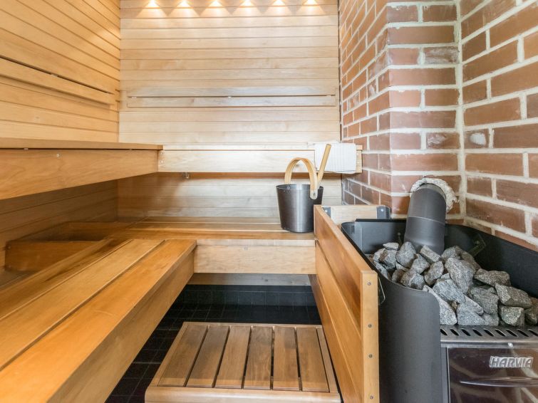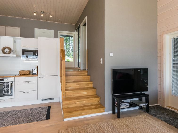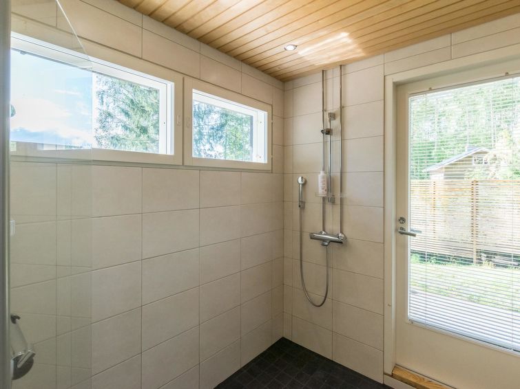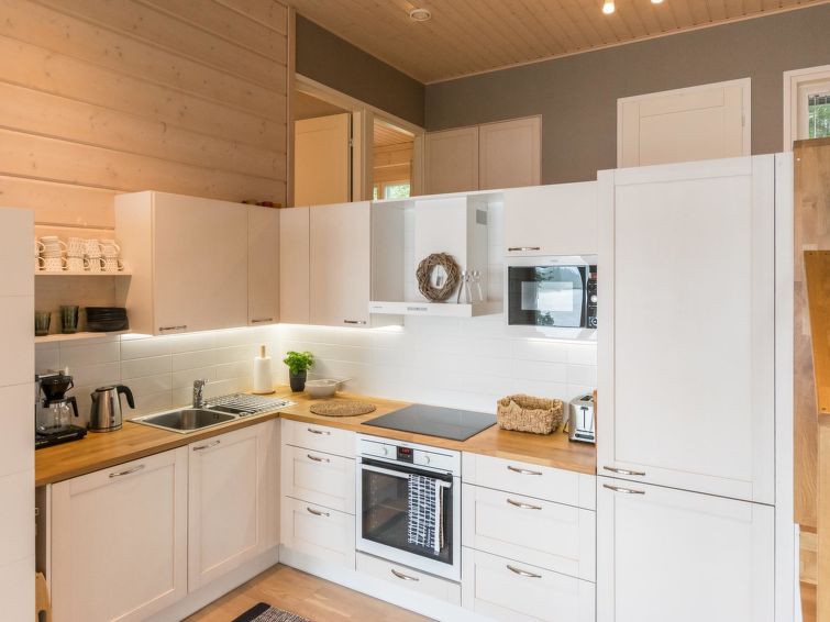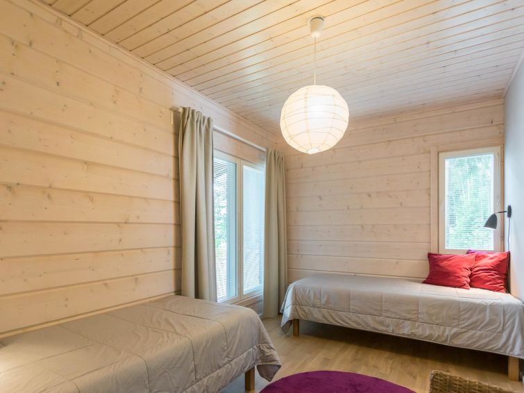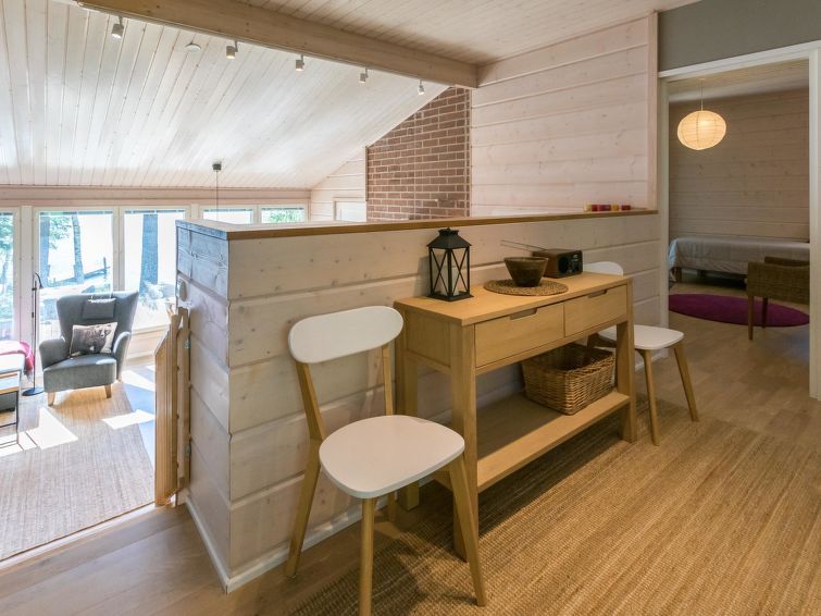 Wooden villa 2016, large kitchen-living room (sofa bed), bedroom 2 beds, bedroom 2 beds, bedroom with one bed and sofa bed. Washroom (2 showers), sauna with views of the lake (wood stove), separate toilet. Extensive partly covered terrace spaces.