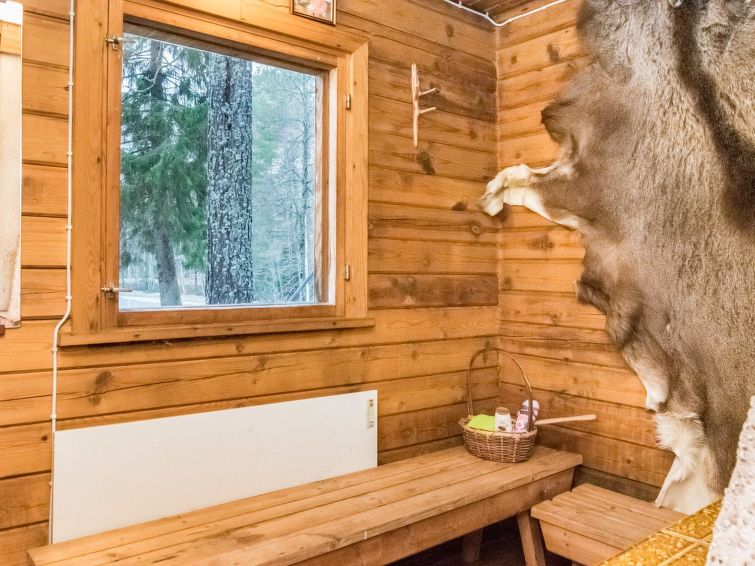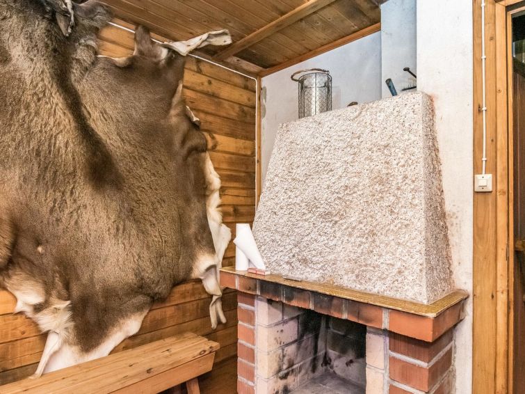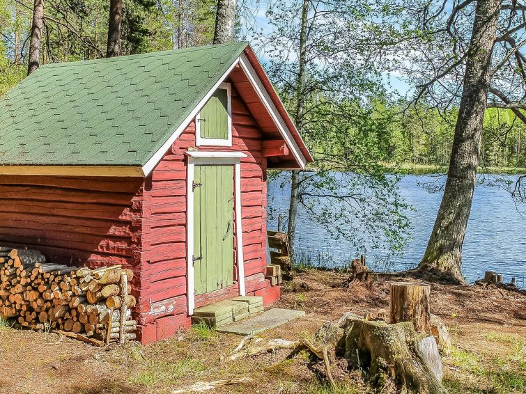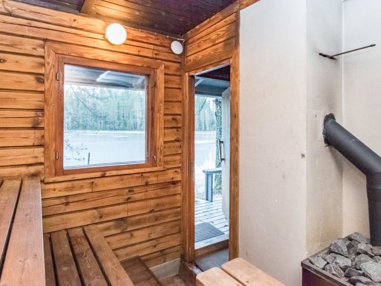 Separate sauna 1972 (10 m²), wood-burning stove and heater tank, carrying water from the pond, electric light, living room with fireplace, a terrace, a swimming beach is 5 m