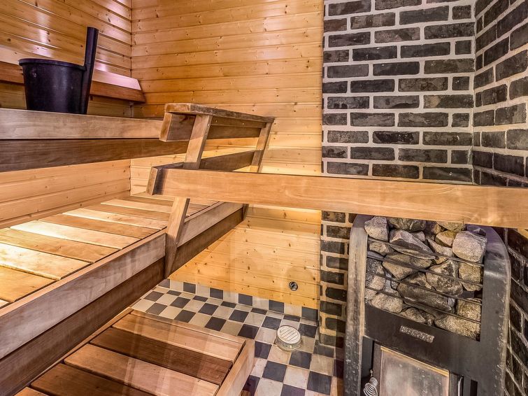 The panel-covered villa in 2007, living kitchen, a spare bed, a TV room with sofa bed, a sauna (heated by wood ), shower room, dressing room. Upstairs (where the steep stairs to) a bedroom (double bed) and bedroom (2 beds) and toilet. Extensive covered terrace space.