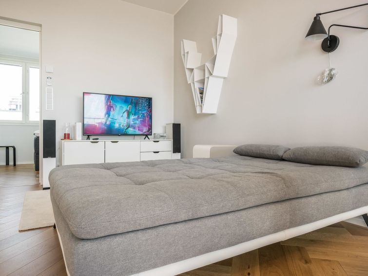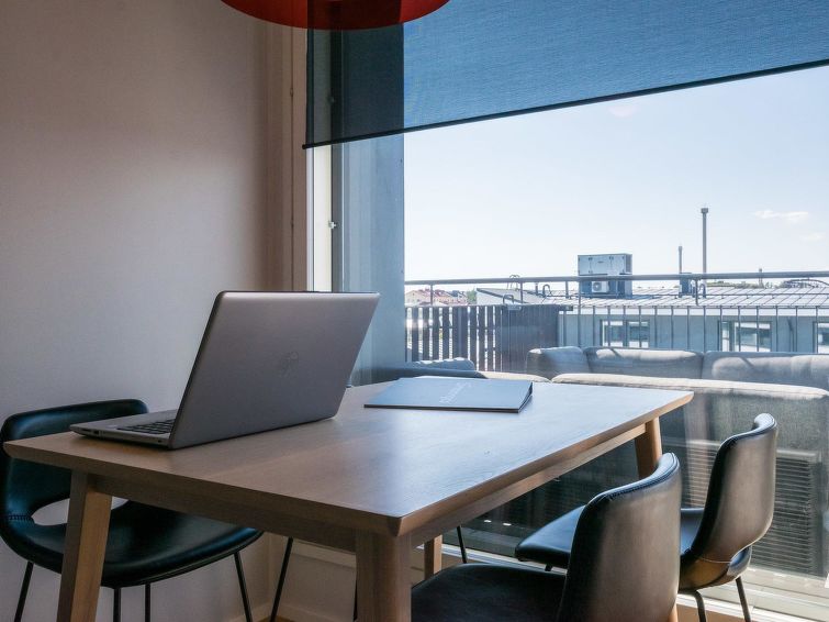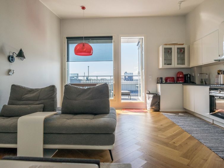 Living room, living room / kitchen, bedroom with double bed, sofa bed for one (120x180 cm) in the living room, washroom/WC, air source heat pump for cooling, full apartment wide terrace with a view over the city, spacious outdoor sofa, dining group and gas grill. . The elevator takes you to the second top floor, from where stairs to the tenth (the uppermost) floor.