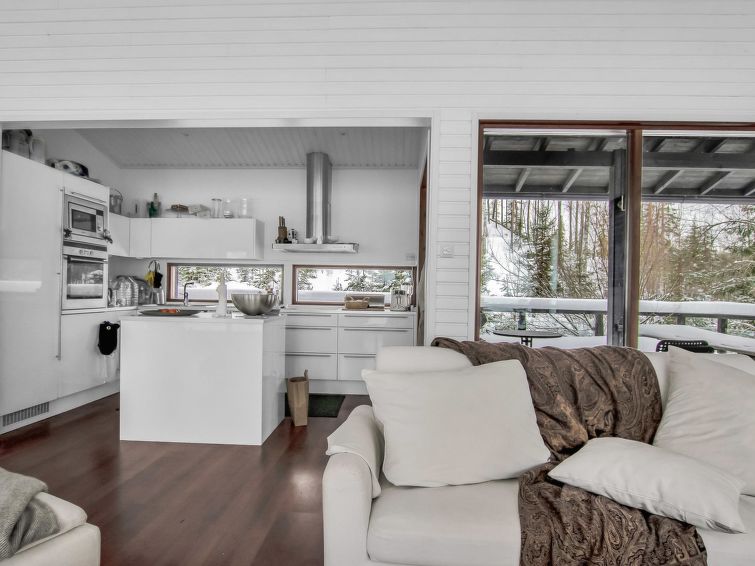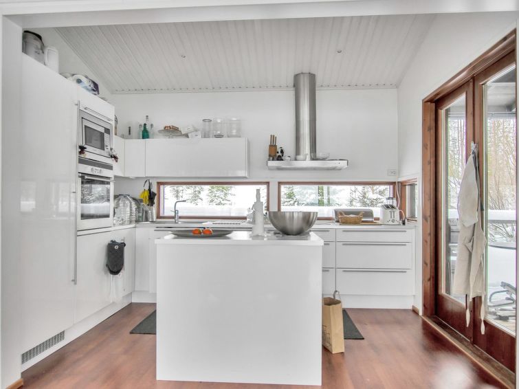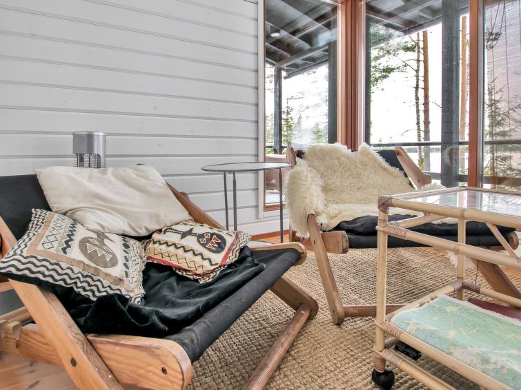 Wooden cabin with boarded outer walls, built in 2004. Wide living room with spacious dining area and fireplace. Living room / kitchen, alcove with two bed chairs, bedroom 1: two beds, bedroom 2: two beds, loft 1 bed.