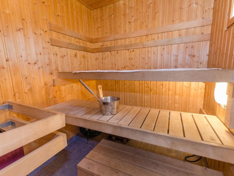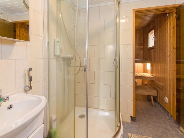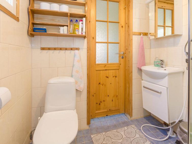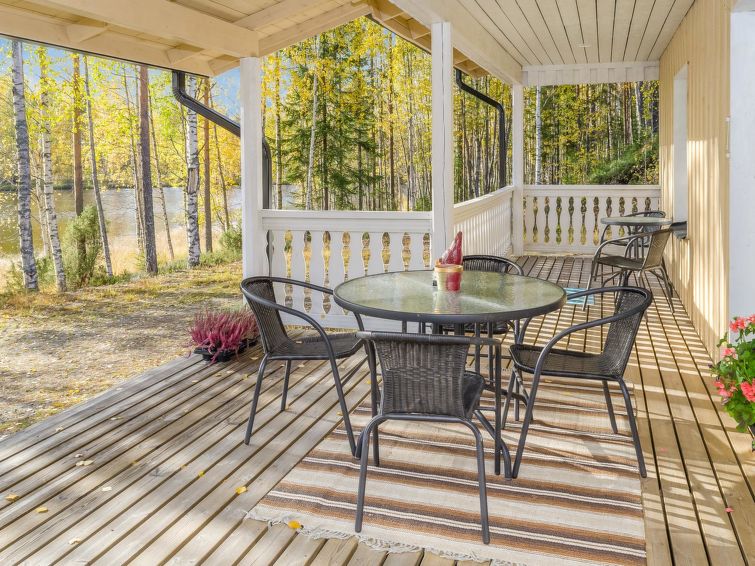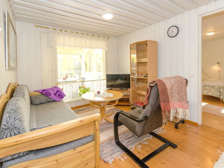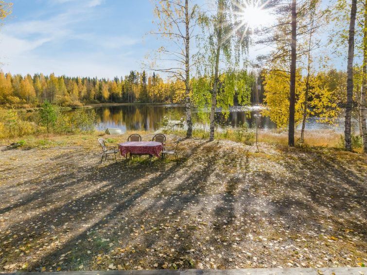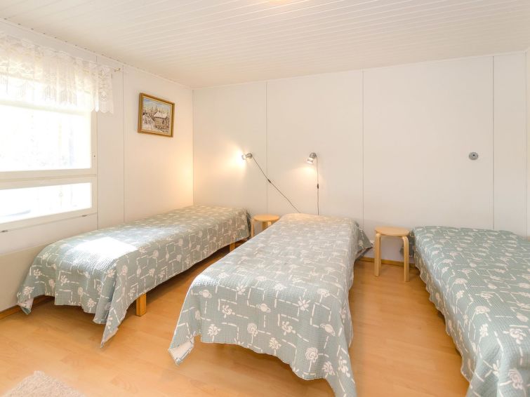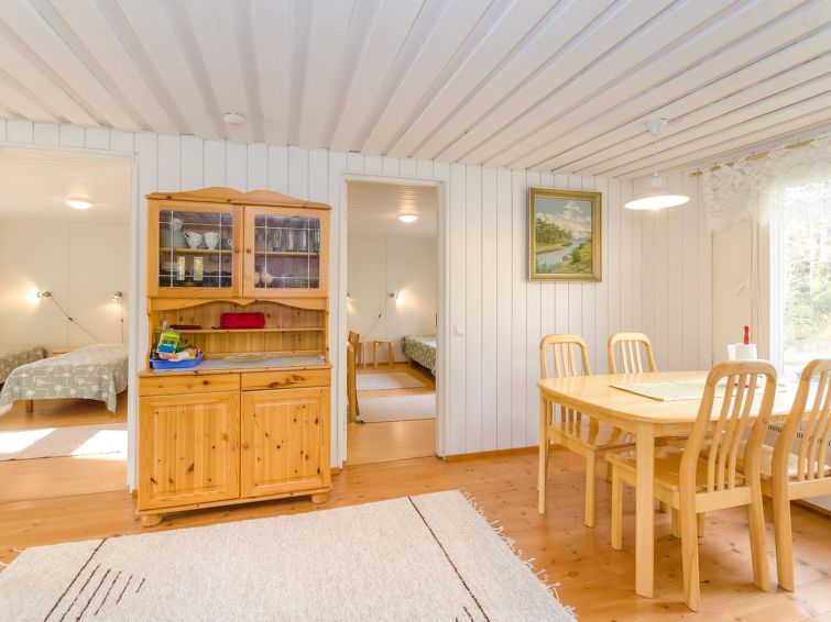 Wooden cottage 2007, living room/kitchen living room/kitchen, bedroom with 3 beds, bedroom with 2 beds + an extra bed, sauna (electric stove), washroom, dressing room, open porch. Cottage suitable for families, on shore of pool. Two bicycles are included in the rent. Several nature trails in vicinity. Mushroom and berry forests next to cottage. Nearest neighbour is located on the other side of the pool. The owner can prepare cross country ski track in the vicinity of the cottage, if agreed in advance and weather/snow conditions are good enough.