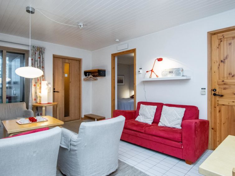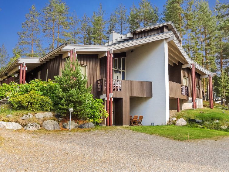 77 km north of Joensuu, Pond Käränkälampi 50 m (length 2 km, width 1,5 km), common beach with shallow hard sand bottom, jetty, no boat. Downstairs apartment of wooden/concrete flat 1990, kitchen-living room with convertible sofa, bedroom with double bed, washroom and sauna (elec. stove). Practical holiday flat situated by the Pond Käränkälampi in Loma-Koli cottage area, suitable for a smaller family. Open surroundings with some pine trees. A relatively peaceful location. Beach suitable for children. The beach faces the South. The flat is suitable for down hill and cross-country skiers; Ukko-Koli slopes 9 km. Apartment is not suitable for 4 adults. Reservations start at 16.00 and end at 12.00 ( also in weekend bookings).