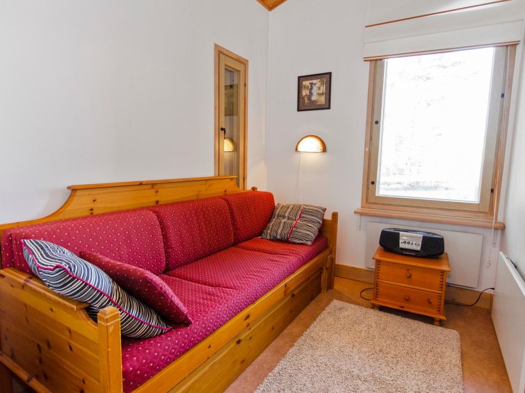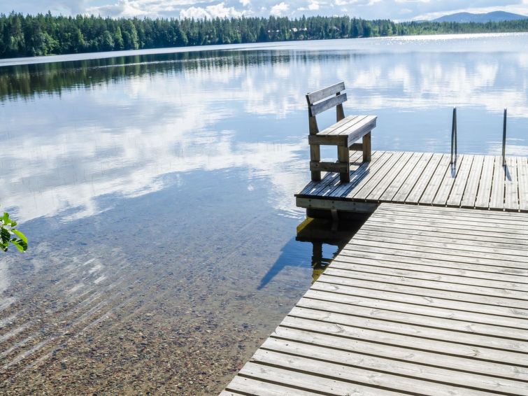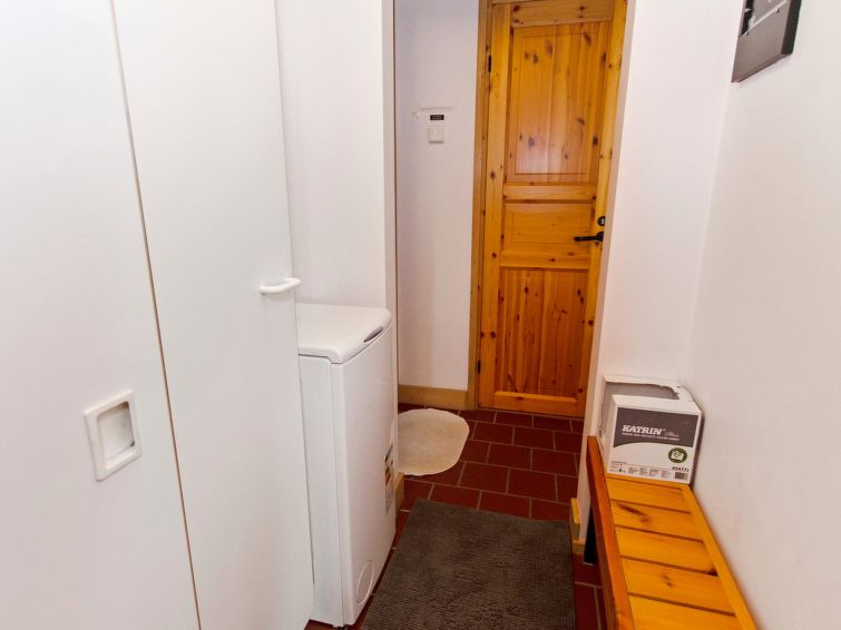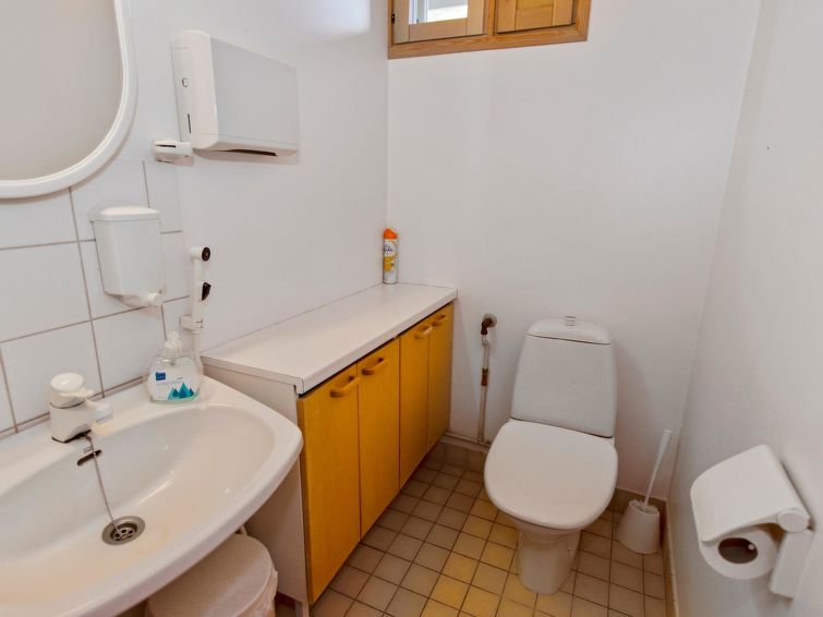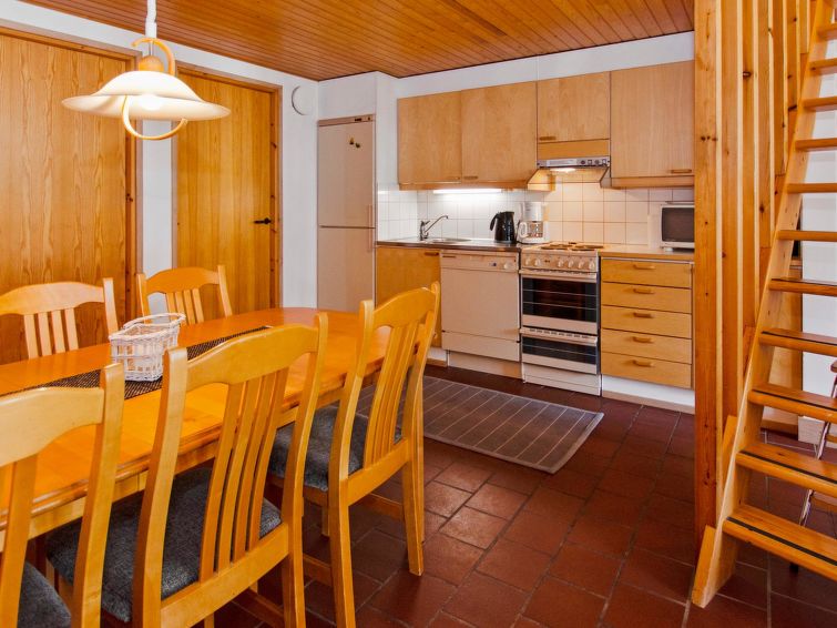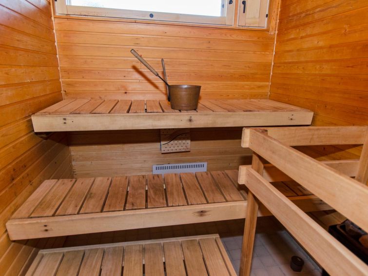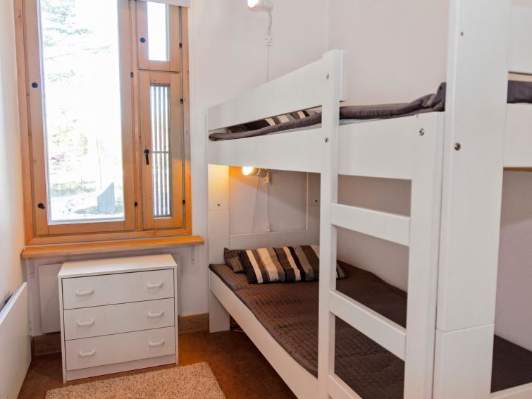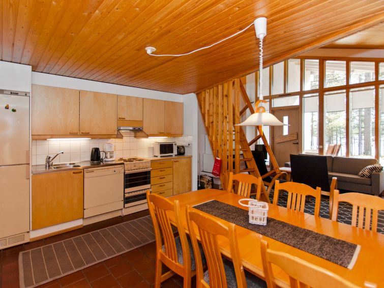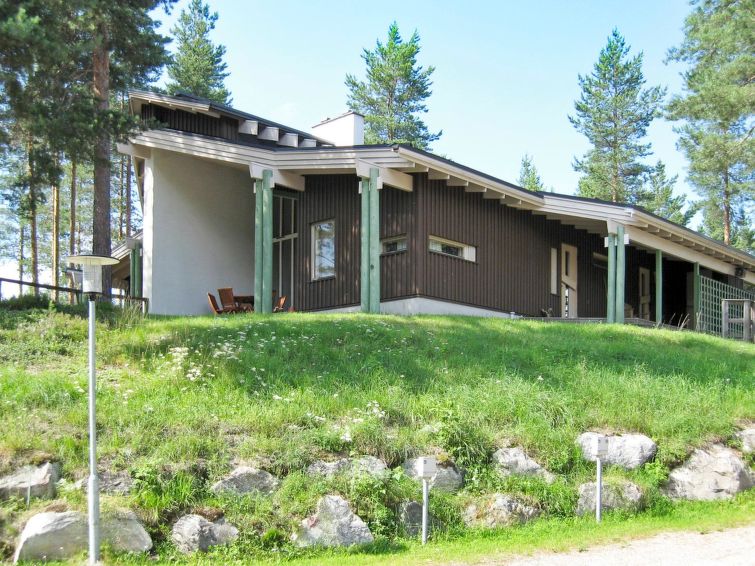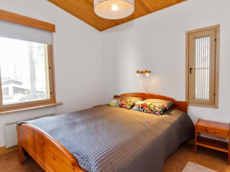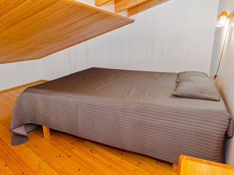 77 km north of Joensuu, Pond Käränkälampi 60 m (length 2 km, width 1,5 km), common beach with shallow hard sand bottom, jetty. Common boat with Hiisiranta C2. Both have their own oars and life jackets. Wooden/concrete flat 1990, kitchen-living room, bedroom with double bed, bedroom with bunk bed, bedroom with convertible sofa, sleeping gallery with two beds, dressing room, washroom, sauna (elec. stove), veranda and balcony. Practical holiday flat situated by the Pond Käränkälampi in Loma-Koli cottage area, suitable for a bigger family. The apartment stands on a slope and there are stairs to the door. Open surroundings with some pine trees. A relatively peaceful location. Beach suitable for children. The beach faces the South. The flat is suitable for down hill and cross-country skiers; Ukko-Koli slopes 9 km. Reservations start at 16.00 and end at 12.00 (also in weekend bookings).