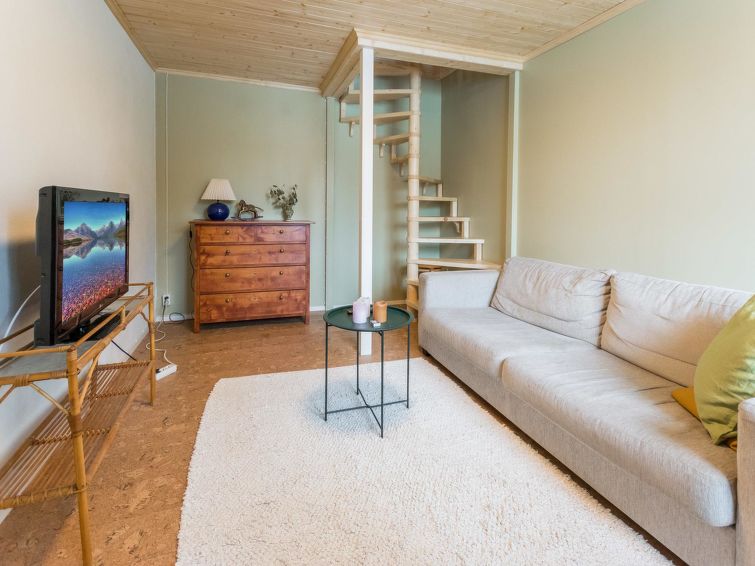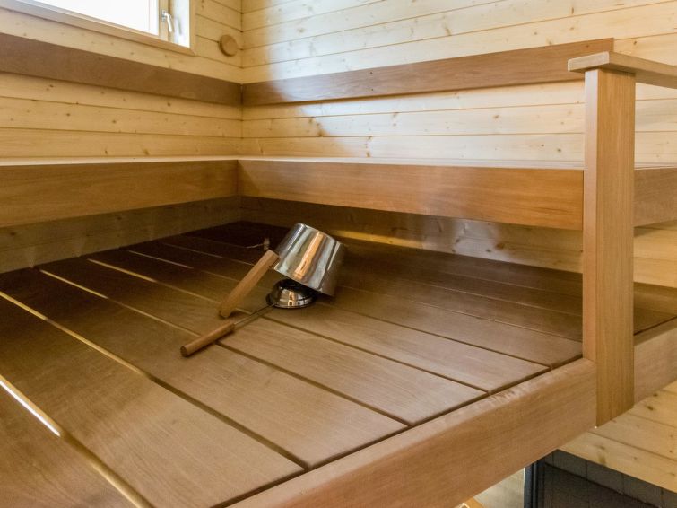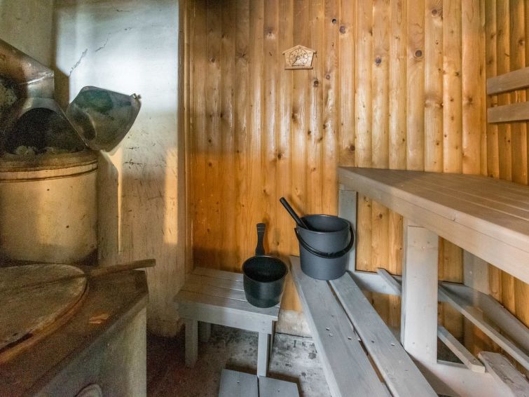 On the ground floor, washroom with WC, wood-heated sauna, living area.