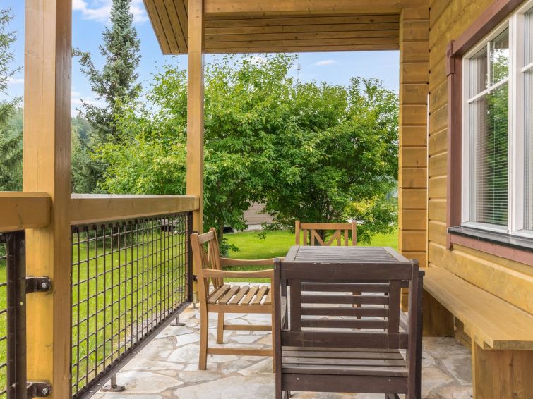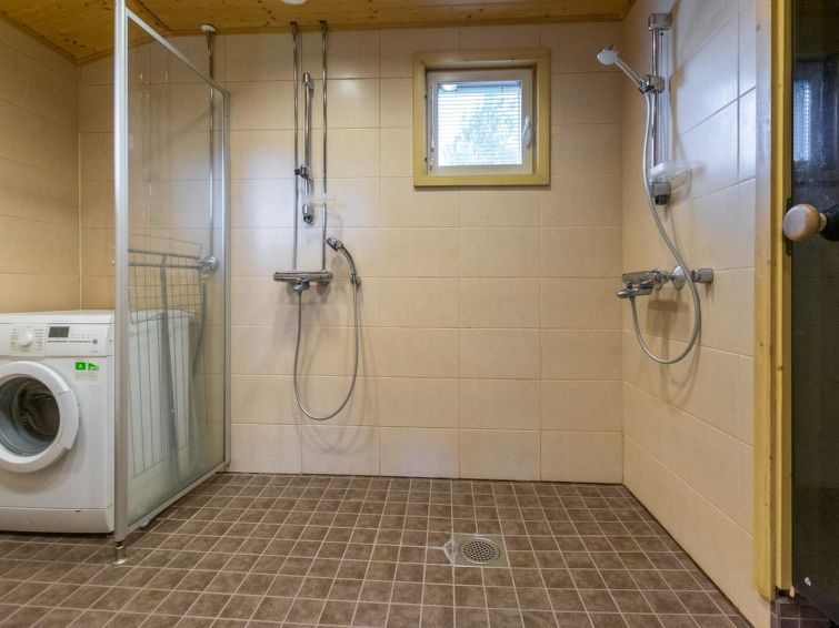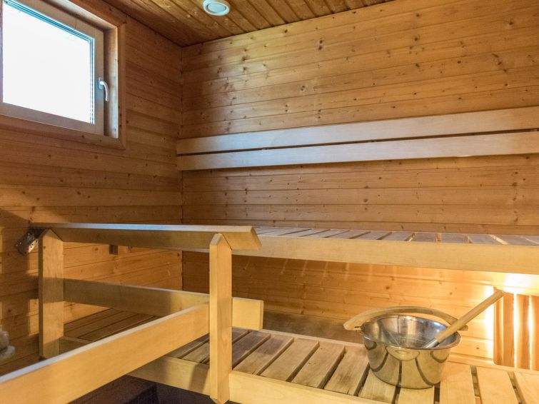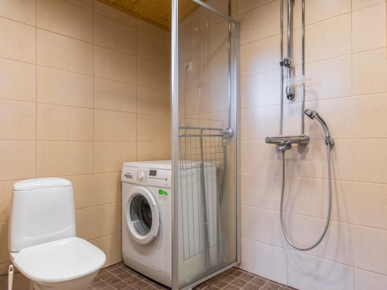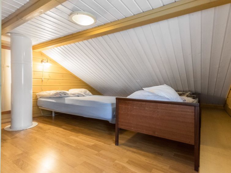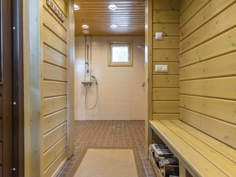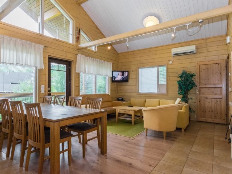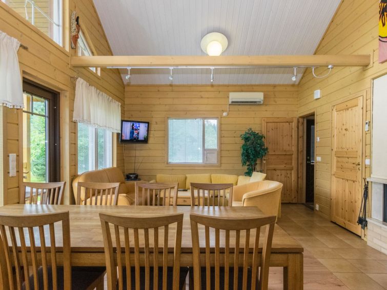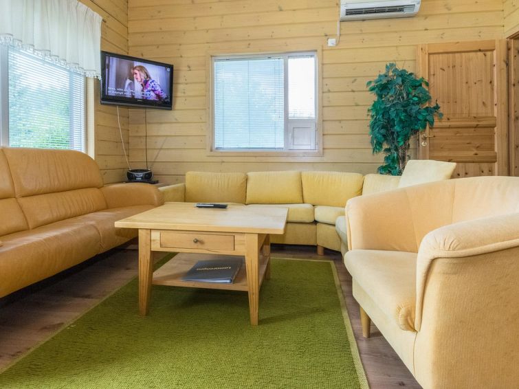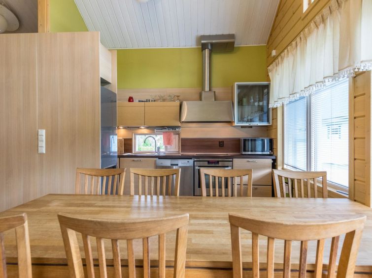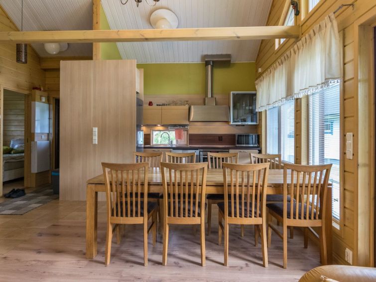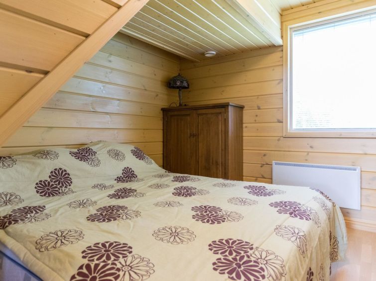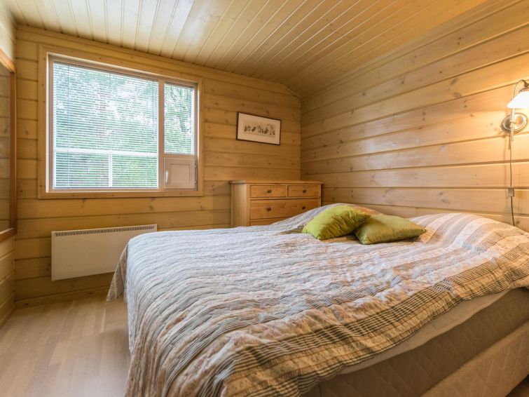 Wooden cabin (2008) features a spacious living room with a heat-storing fireplace and air source heat pump, a kitchenette, and two bedrooms - one with a double bed and the other with two single beds. On the upper floor, a sleeping area with three beds. Separate WC, electric sauna, bathroom with shower, another WC, and a washing machine. The plot is flat and open, where the sunlight can shine all day. There is plenty of space in the yard for multiple cars. Wall outlets for pre-heating the car are available in the yard. Charging of electric vehicles is prohibited.