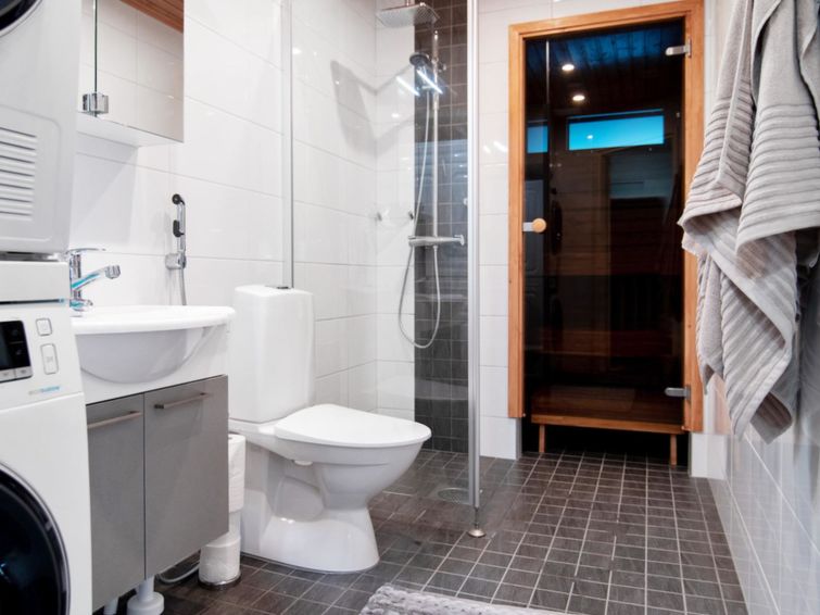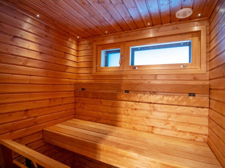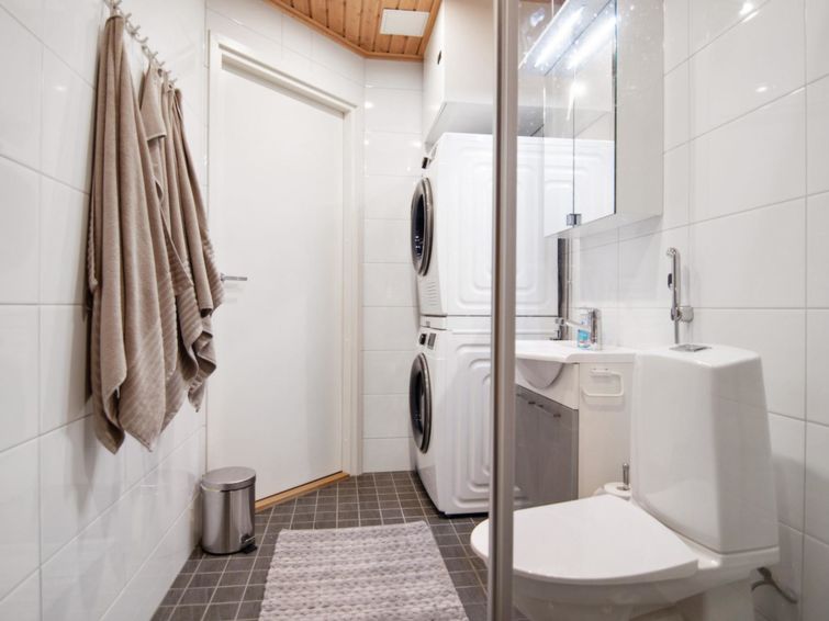 There is a kitchen, bedroom with a 160cm double bed, sofa-bed 140cm wide, toilet and shower, sauna and own parking lot.