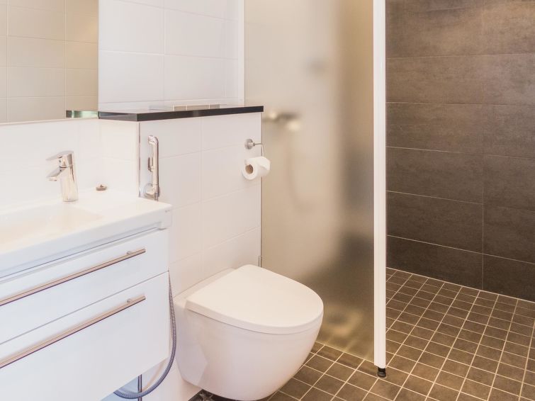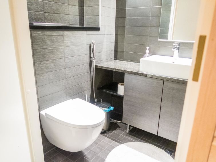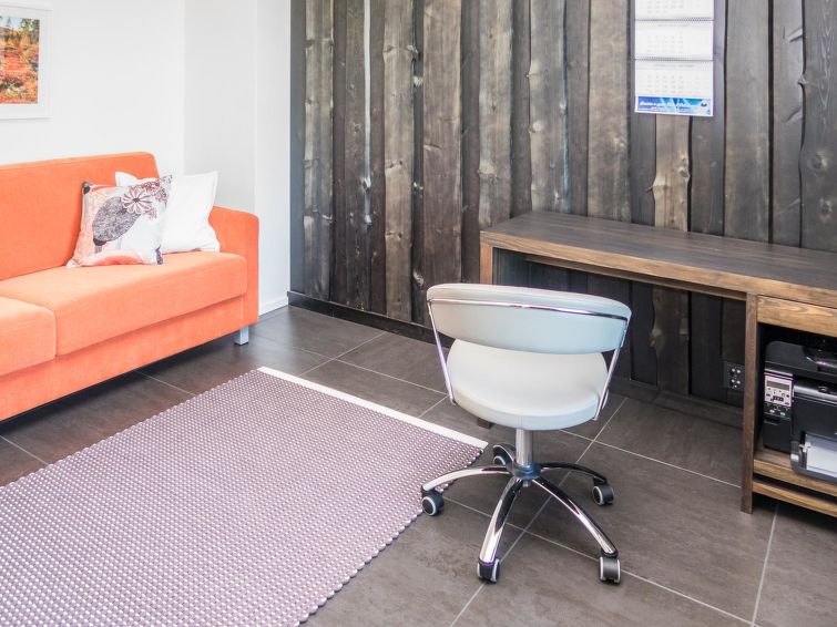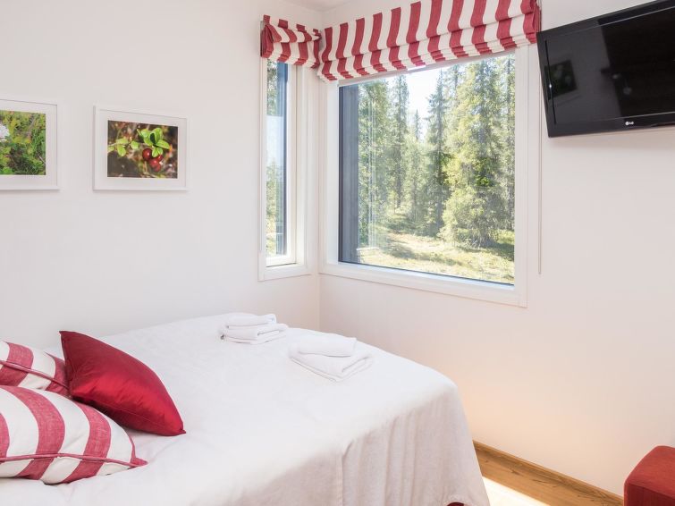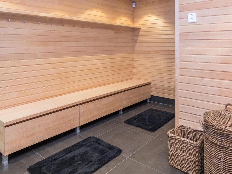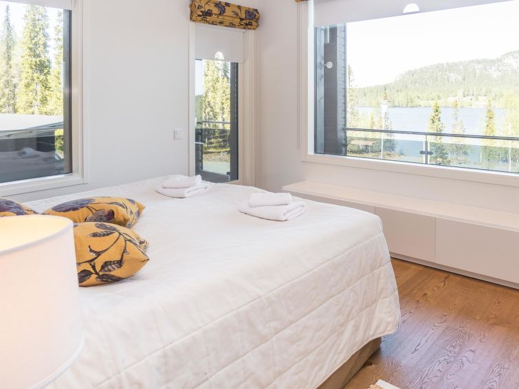 22 km north from Kuusamo, Ruka Village (Western Ruka) 7.0 km. Apartment in a luxus semi-detached house in a fantastic location by the Lake Pyhäjärvi, built in 2014. Upstairs: Bedroom 1(master bedroom): double bed, toilet, shower/bathtub. Bedroom 2: double bed, toilet, shower. Bedroom 3: double bed, toilet, shower. Downstairs: Bedroom 1: double bed, toilet, shower. "Office room: sofa bed for two. Combined living room/kitchen, electric sauna. Totally 6 toilets and 6 showers. Apartment of a high level, located Hietavaarantie - road, by the Lake Pyhäjärvi.