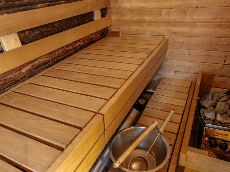Log-built semi-detached house, built in 1989. Living room, kitchen, 2 bedrooms, both with 120 cm bed with 1 upper bed, loft with 2 mattresses, steep stairs to loft, sauna (electric stove), bathroom, separate toilet.