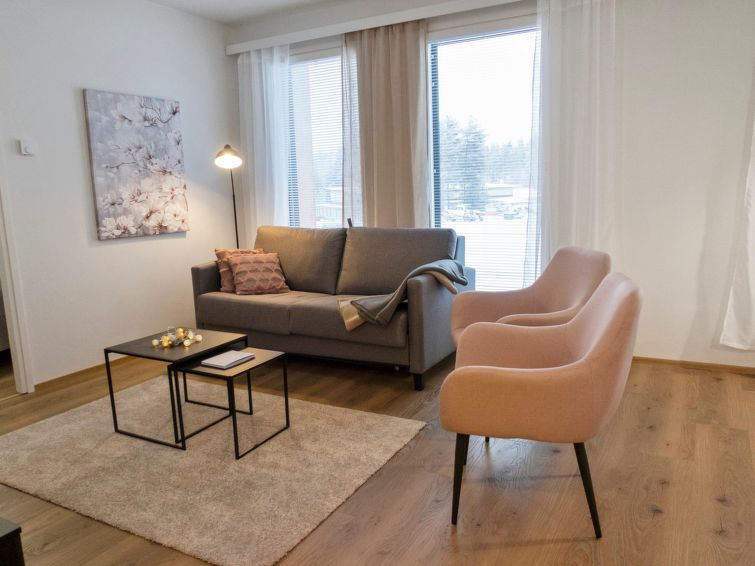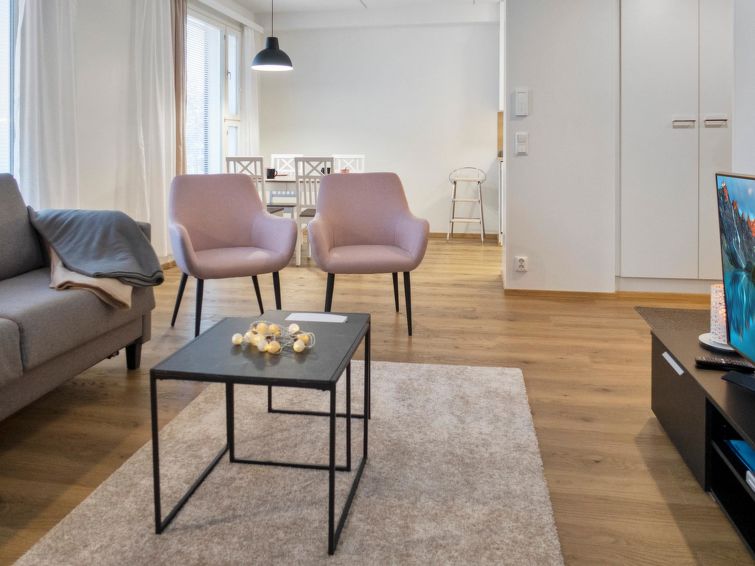 Total area is 53 m², bright living room/kitchen with lake view, spacious windows, dining group for 4 and working desk for remote working. Spacious bedroom with double bed and wardrobes. Spreadable sofa bed in the living area, width 140 cm x 200 cm, for 2 people, 1 x mattress as an alternative bed.