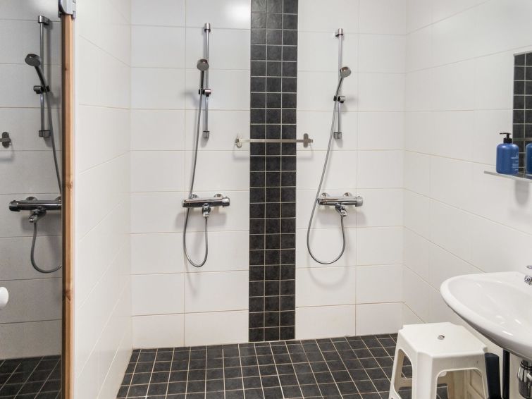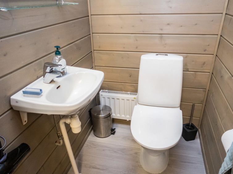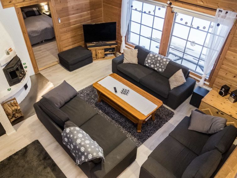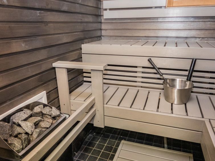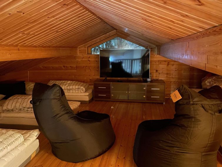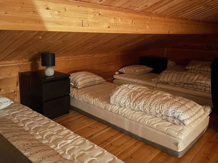 Master bedroom with 180 cm wide double bed, bedrooms 2-4: 2 beds in each, loft (28 m², low room height): 6 high quality Tempur-mattresses, steep stairs to loft, combined kitchen/living room, electric sauna.