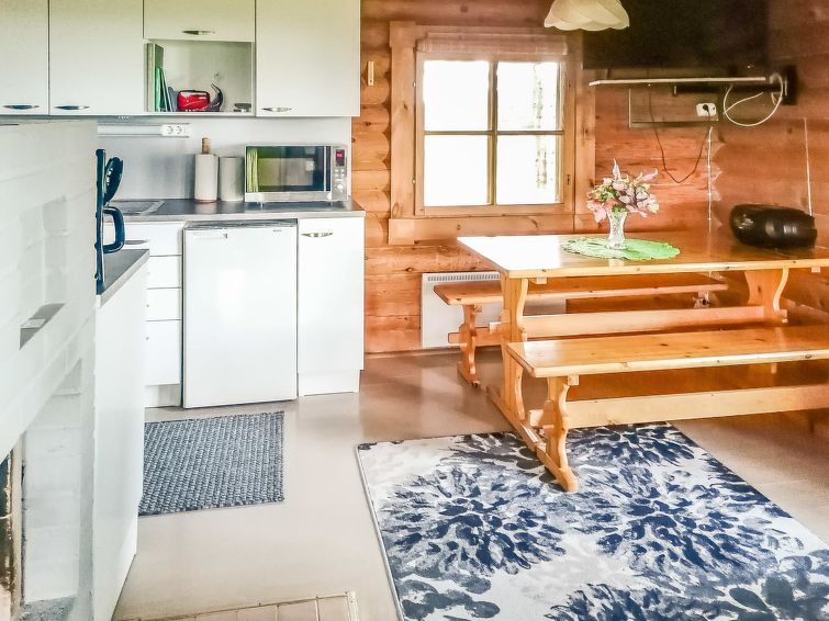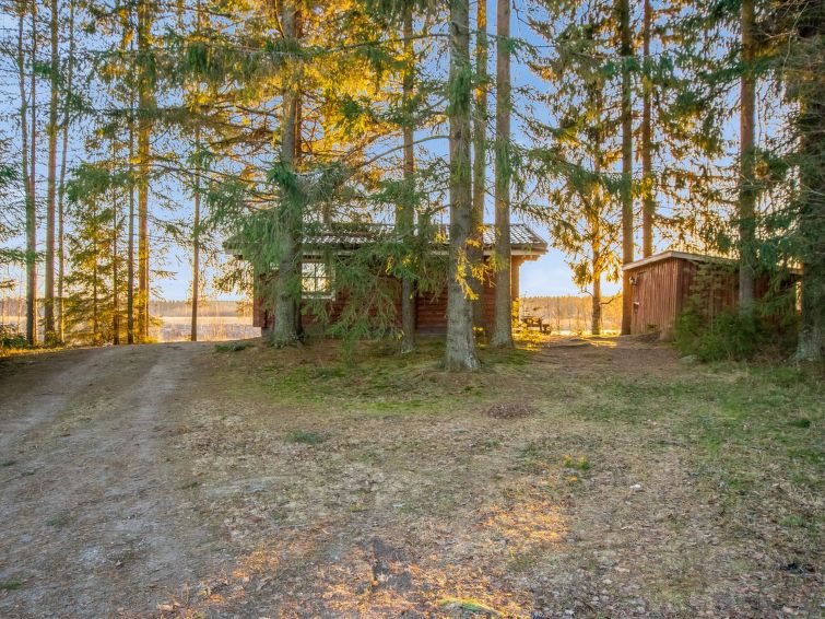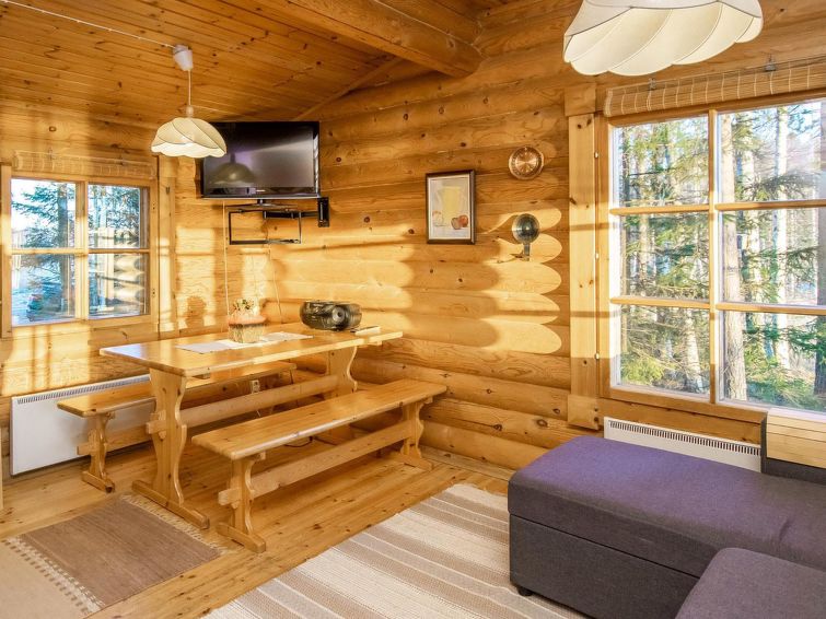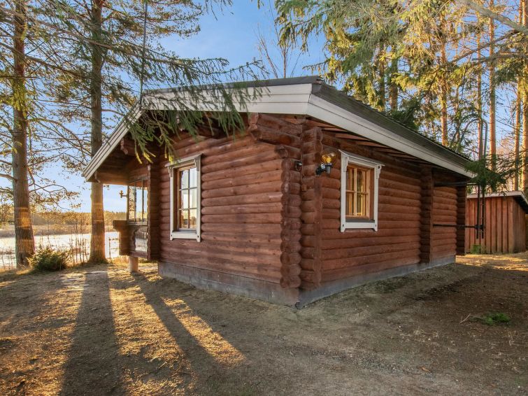 Log cabin 1990, living room/kitchen 1 sofa (for two persons), bedroom with 2 beds, dressing room, sauna (electric and wood sauna stove), glazed veranda. Entrance to sauna and toilet via veranda. Neighbor cottage 100 m, distance between piers is 50 m.
