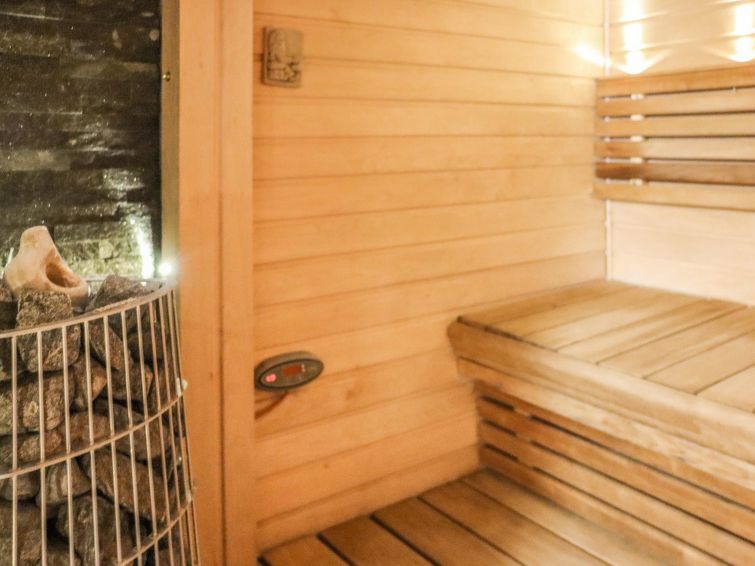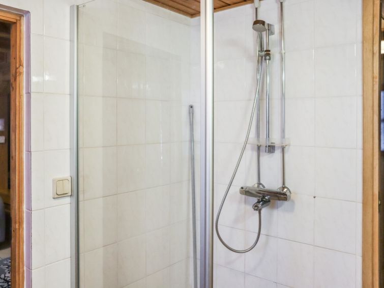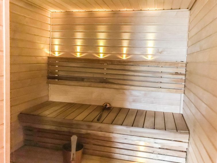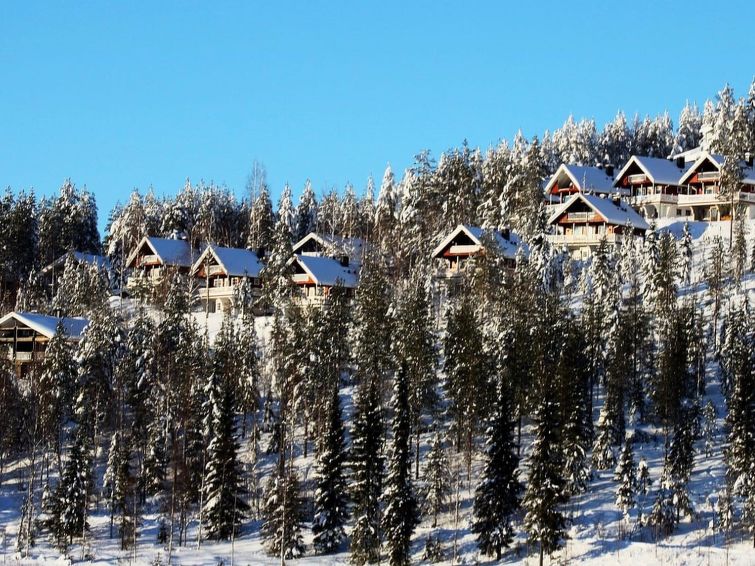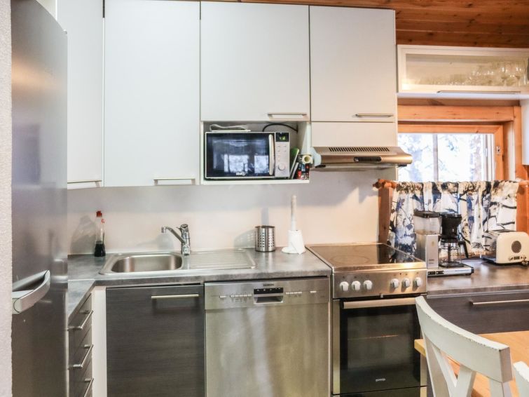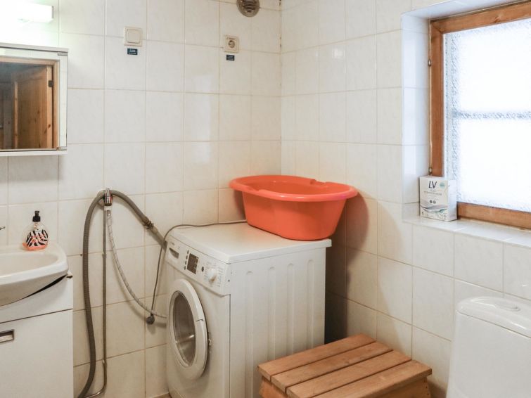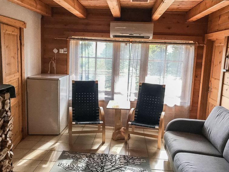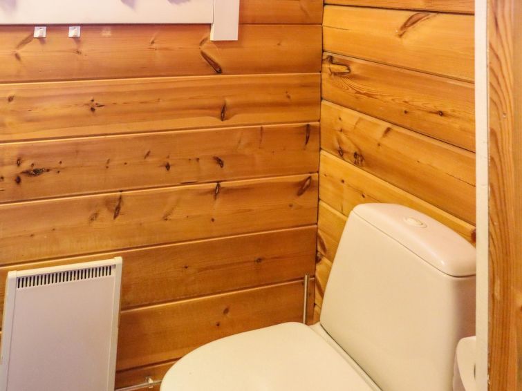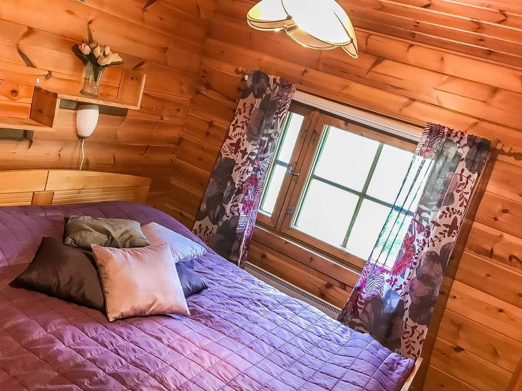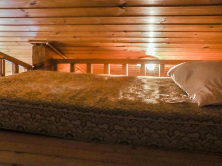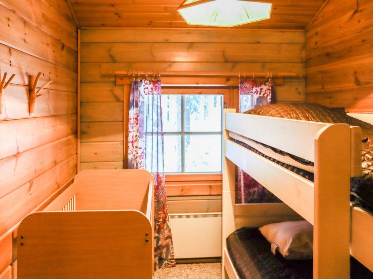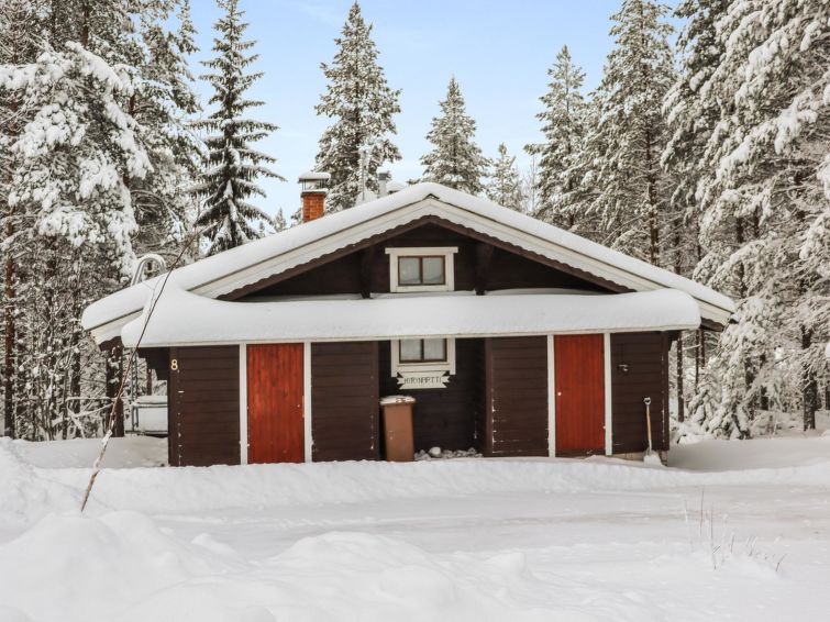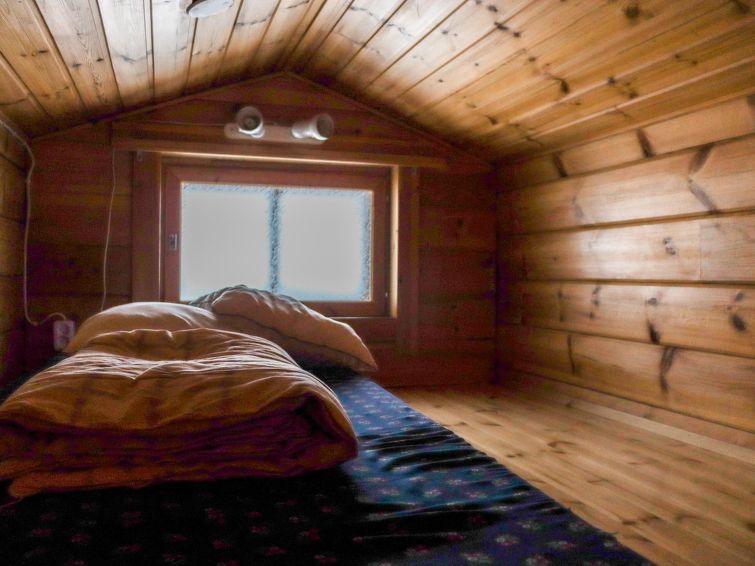 Log cottage located in the Ukkohalla tourism centre, 90m2 + loft 12m2, built in 1991. Premises on 3 floors, kitchen, 2 bedrooms, sleeping corner, loft, sauna, shower room/toilet, separate toilet, room with a fireplace including a bed and a sofa-bed, storage, balcony, terrace, porch, fireplace and firewoods.. A double bed in the other bedroom and a bunk bed in the other, 2 mattresses on the loft, a sofa-bed in the living room. There is a air sour pump and grill, which is not in use and will not be rented to customers.