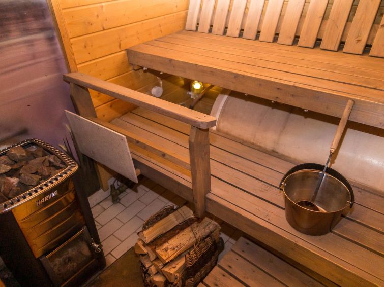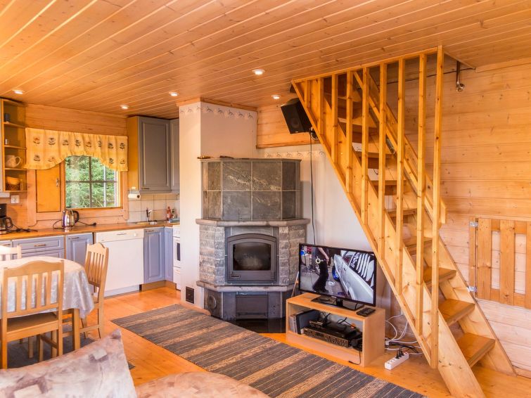 Log cabin, which is built in 2000, has two floors; in the ground floor kitchen, washroom, sauna (wood-burning stove), hall, terrace. Upstairs 2 bedrooms with double beds (140 cm wide) + 1 bed in each, balcony. Rather steep stairs to the upper floor.