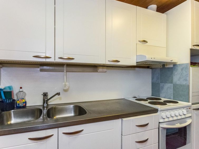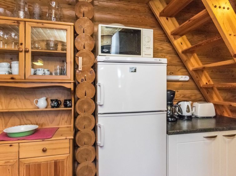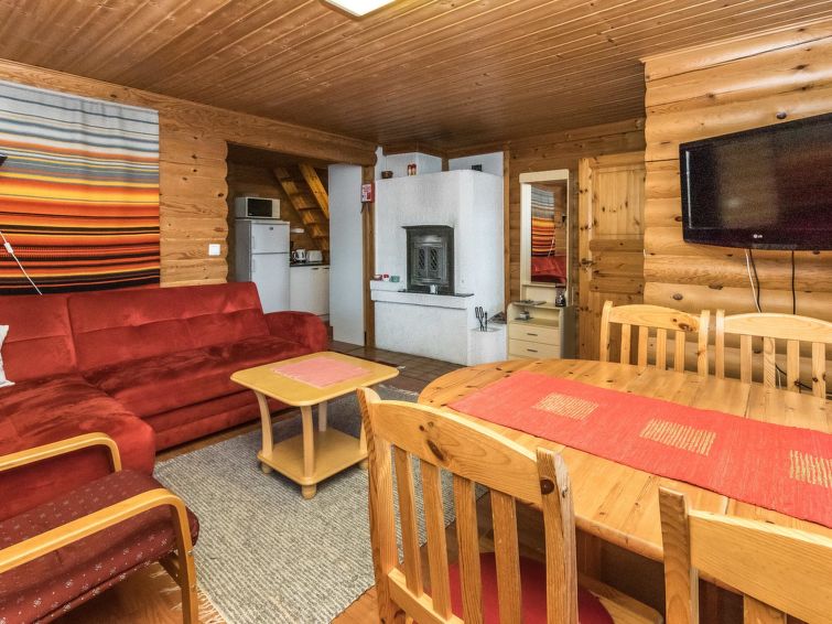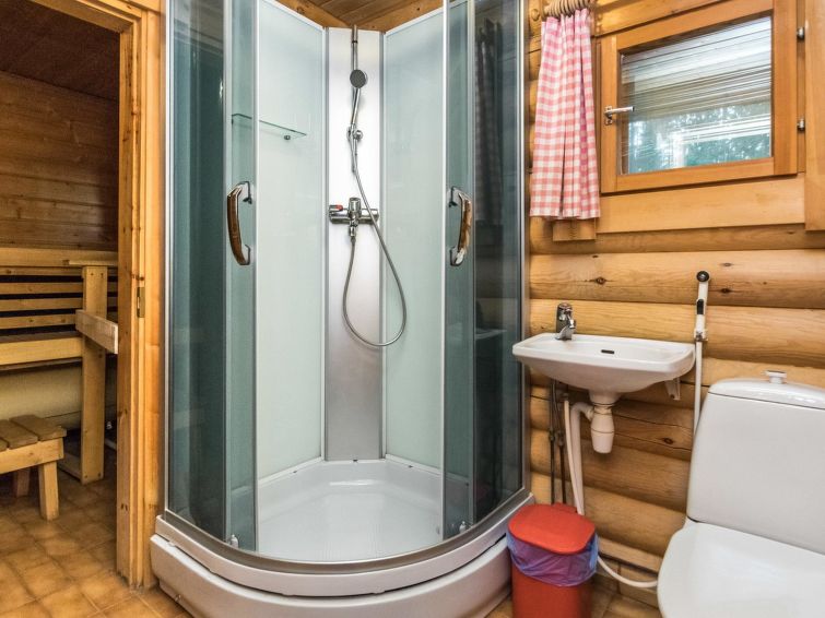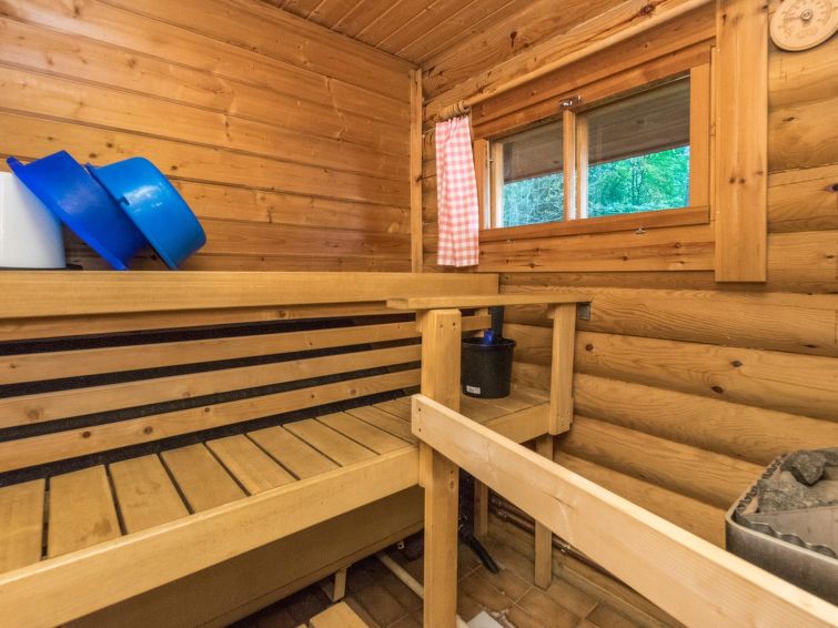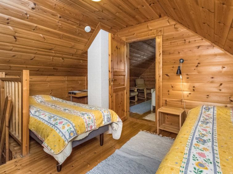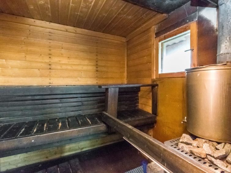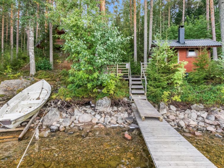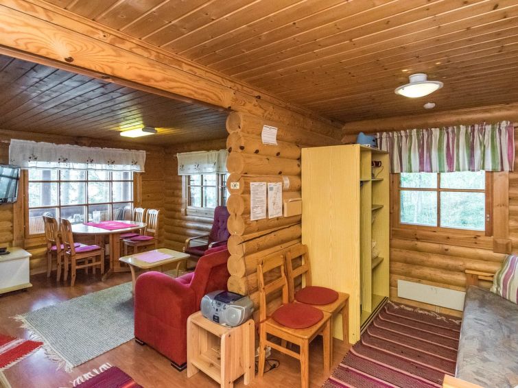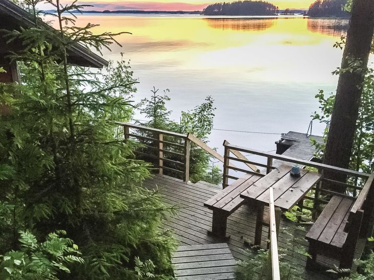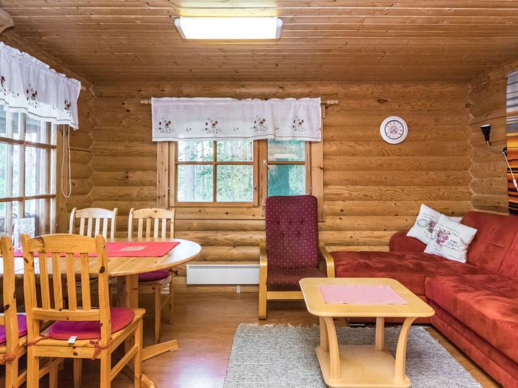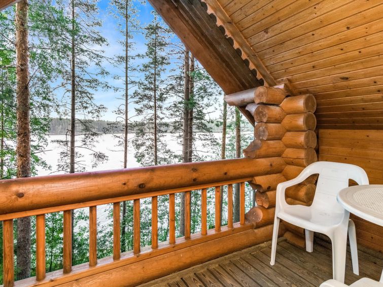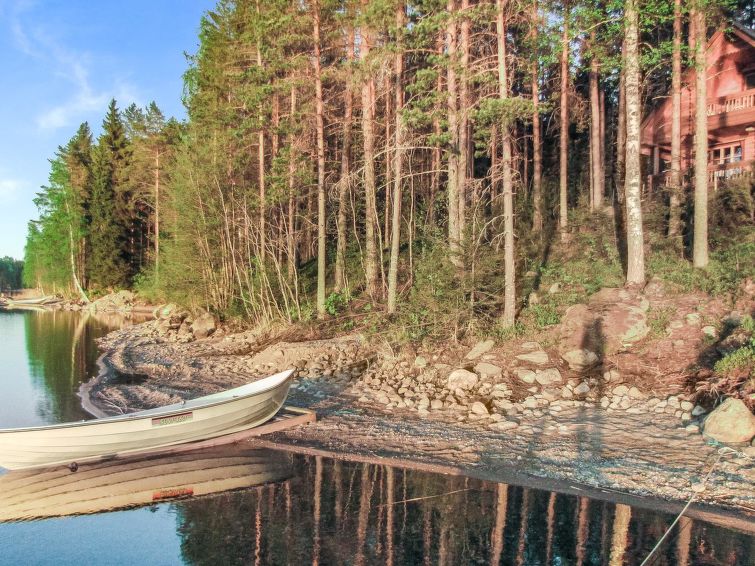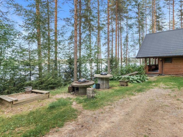 56 km south of Savonlinna. Lake Saimaa 25 m, shallow water, firm gravel bottom. Own boat. Log cabin 199, kitchen, living room with 1 extra bed (convertible sofa), washroom, sauna (electric sauna stove), open veranda. Upstairs: bedrooms with 2 beds, vestibul 2 beds, balcony (steep stairs to upstairs). Lakeside sauna. Tended ski trails from the cottage. A fairly steep slope from cottage to beach.