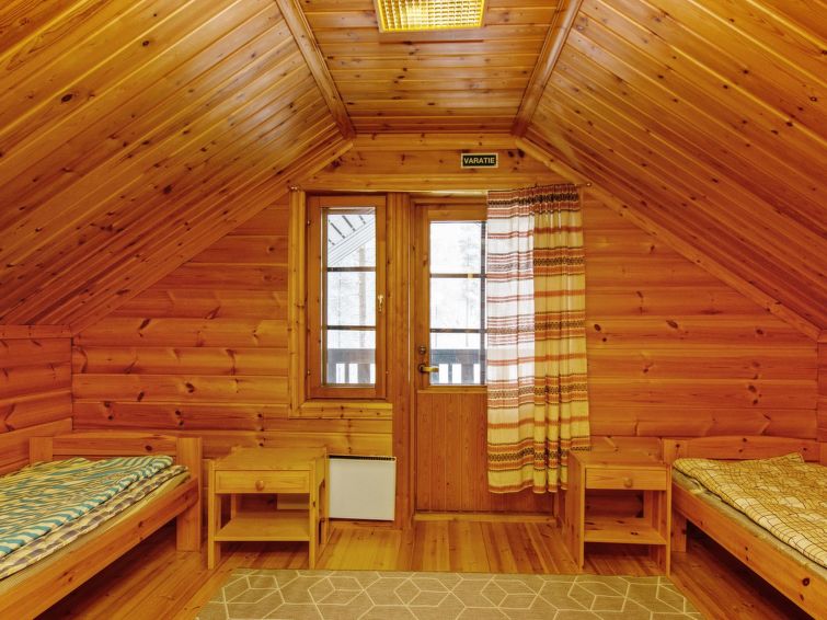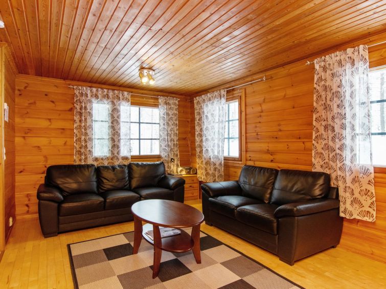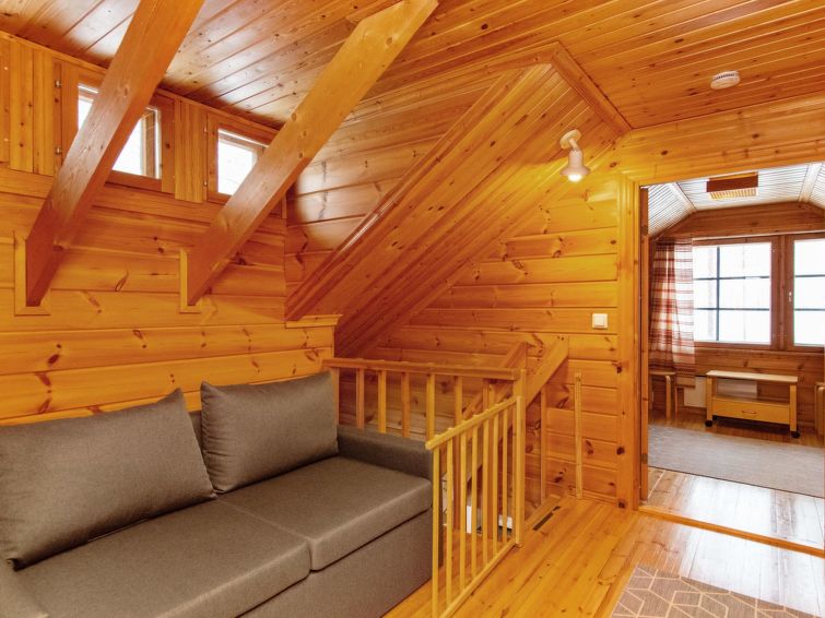 Spacey chalet of massive logs. Living room with a sofa bed and kitchenette, downstairs bedroom with double-bed, and in both upstairs bedrooms 2 beds, and in the upstairs hallway a sofa bed.