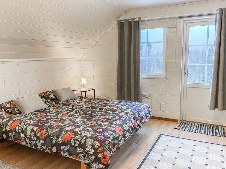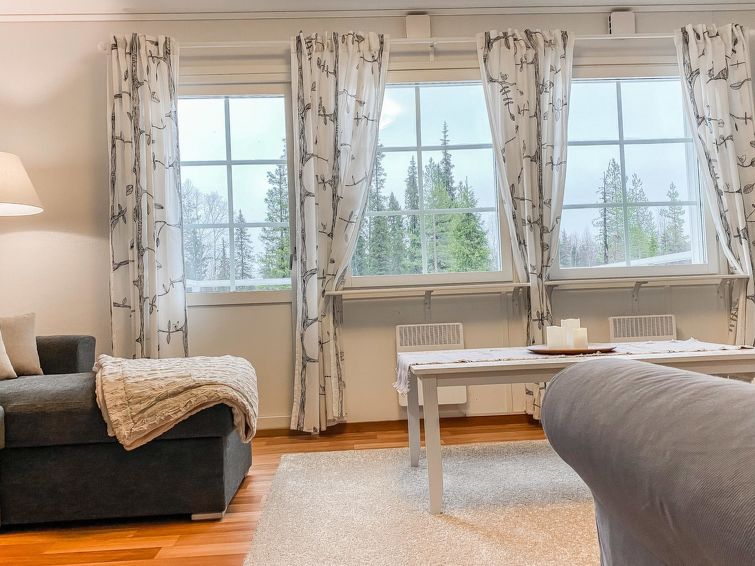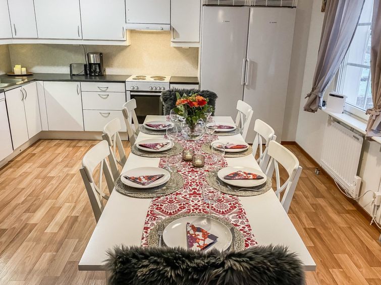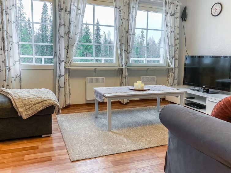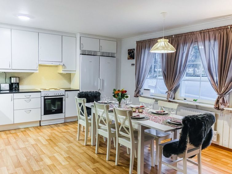Cozy and spacious apartment in a semi-detached house on peaceful location. Services of Ruka ski resort and ski slopes are within 10 min driving distance. Lighted road from Rukajärventie-road to the cottage yard. Facilities like ski trail (700 m) and husky farm (2 km) are nearby. Possibility to rent a rowing boat to the shore of nearby Pyhäjärvi for an additional fee of 70 e / week, reservations through a cottage caretaker.