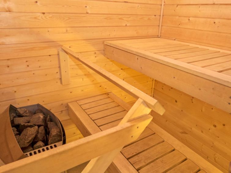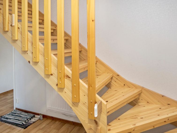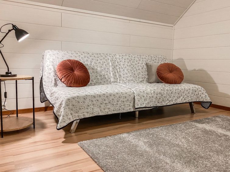 On the ground floor, lobby, living room with a sofa bed, bedroom: 2 beds á 80x200 cm (connected together but can be separated), utility room, washroom+WC, electric sauna, separate WC, large kitchen with dining table for 8 persons, two terraces.