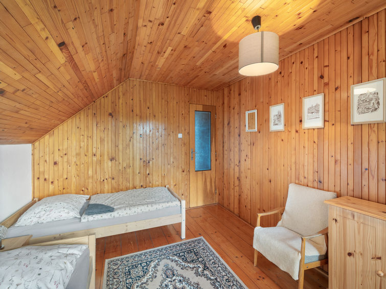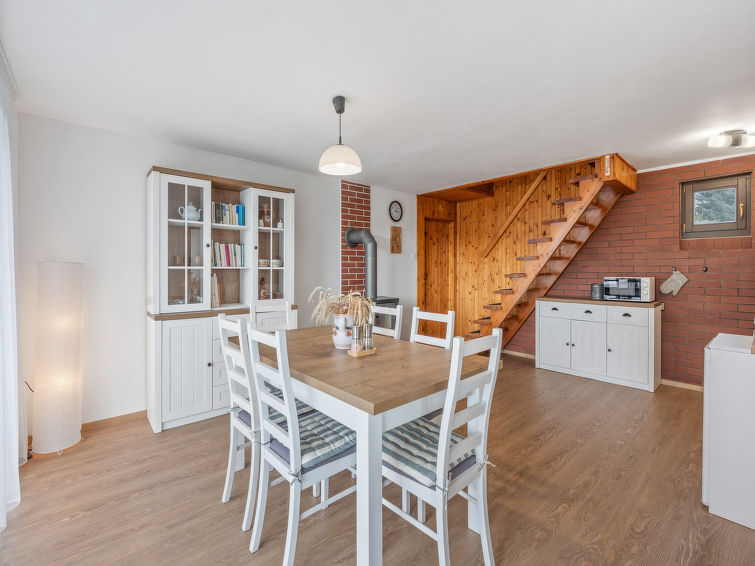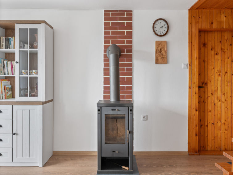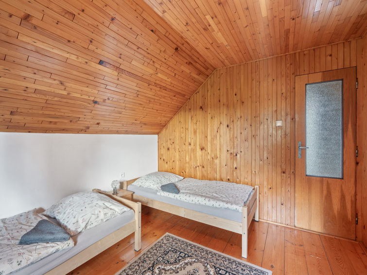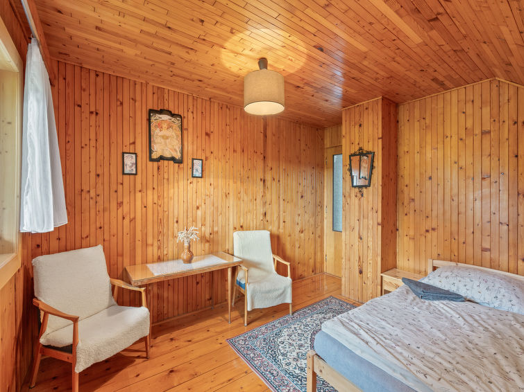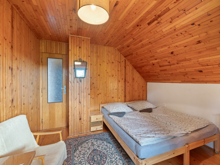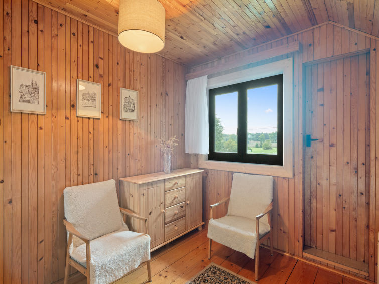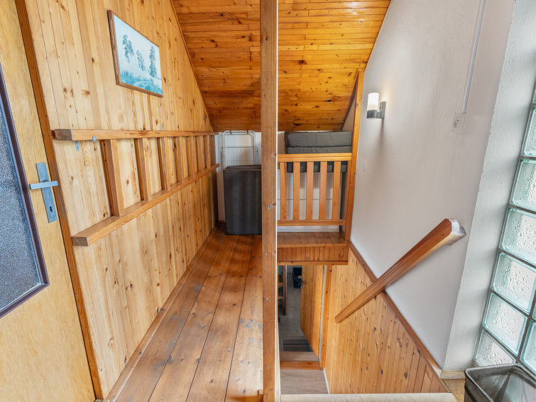 4 rom hytte på 2 etasjer. Stue med, vedovn. Åpen gjennomgangsrom med, 2 klappsenger. Kjøkken (4 keramiske kokeplater, brødrister, vannkoker, mikrobølgeovn, frys) med spisebord. Bad, sep. WC. Vannkoker (50 liter). øverste etasje: (bratt trapp), 1 rom med, 1 dobbeltseng. Utgang til balkongen. 1 rom med 2 senger. Utgang til balkongen. 1 rom med, 1 dobbeltseng (120 cm). El-oppvarming, vedoppvarming. Balkong. Terrassemøbler, grill. Fasiliteter: vaskemaskin, hårføner. Internett (trådløs LAN [WLAN], gratis). Vennligst merk: velegnet for familier. Røykfritt hus. Max kjæledyr/små hunder tillatt 3 kjæledyr/små hunder tillatt.