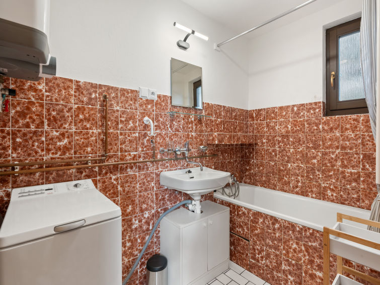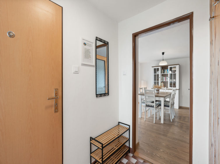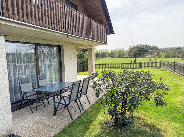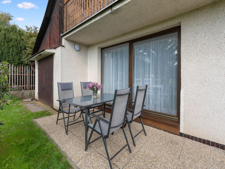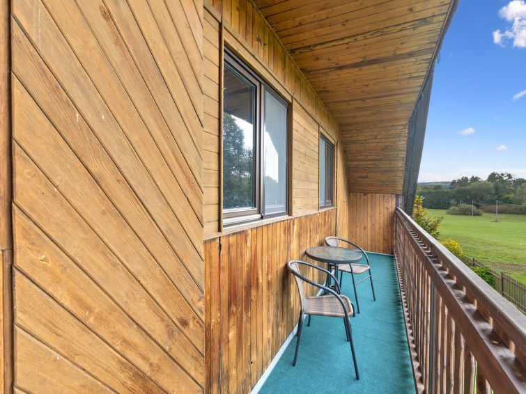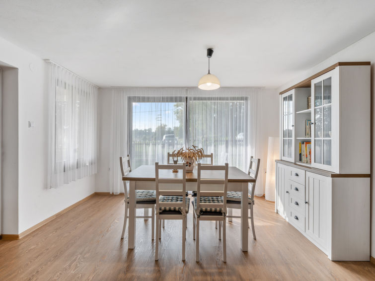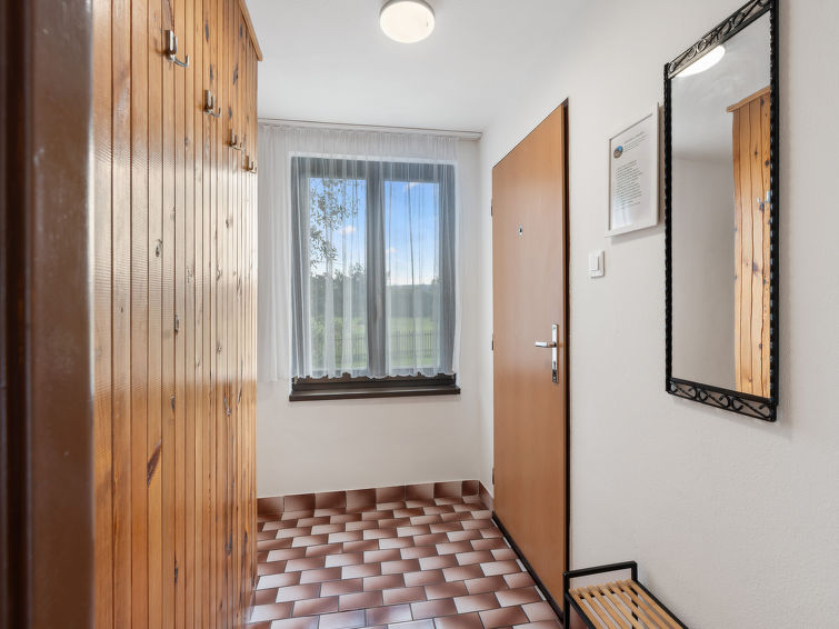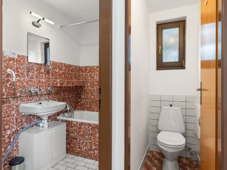 4 rom hytte på 2 etasjer. Stue med, vedovn. Åpen gjennomgangsrom med, 2 klappsenger. Kjøkken (4 keramiske kokeplater, brødrister, vannkoker, mikrobølgeovn, frys) med spisebord. Bad, sep. WC. Vannkoker (50 liter). øverste etasje: (bratt trapp), 1 rom med, 1 dobbeltseng. Utgang til balkongen. 1 rom med 2 senger. Utgang til balkongen. 1 rom med, 1 dobbeltseng (120 cm). El-oppvarming, vedoppvarming. Balkong. Terrassemøbler, grill. Fasiliteter: vaskemaskin, hårføner. Internett (trådløs LAN [WLAN], gratis). Vennligst merk: velegnet for familier. Røykfritt hus. Max kjæledyr/små hunder tillatt 3 kjæledyr/små hunder tillatt.