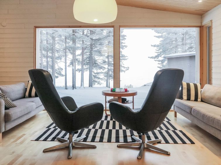 Modern villa on the shore of lake Oulujärvi. From its large windows there is excellent views of the lake. Two of the beds are in the separate building by the bech.