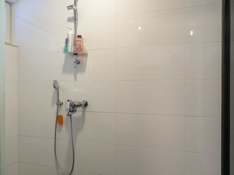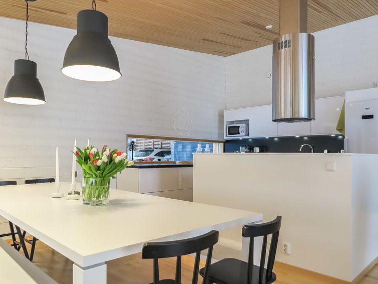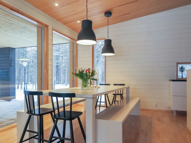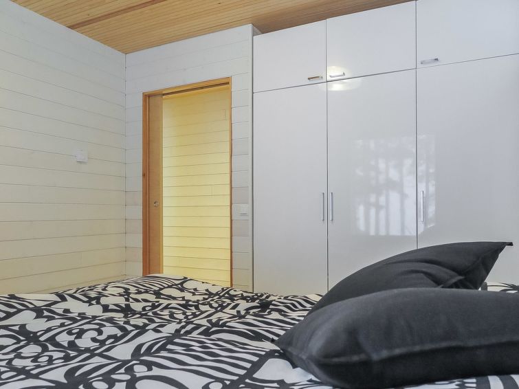 Wooden villa, built in 2016. Living-room kitchen, bedroom with 2 beds (made as double bed), second bedroom with 2 single beds, upstairs 7 beds, low ceiling upstairs (maximum height 160 cm), utility room with shower, separate toilet, partially covered large terrace. Underfloor heating throughout the ground floor (geothermal). Also equipped with a cooling device connected to geothermal heat. No sauna in the villa, but there is a separate lakeside sauna.
