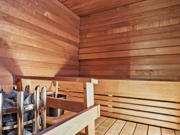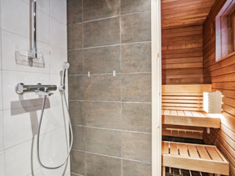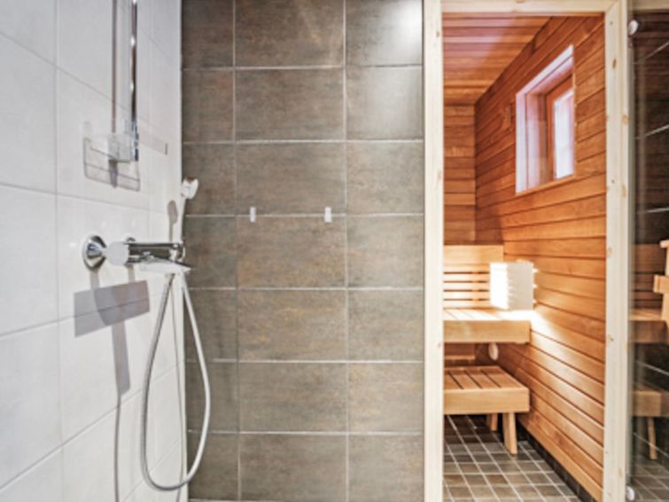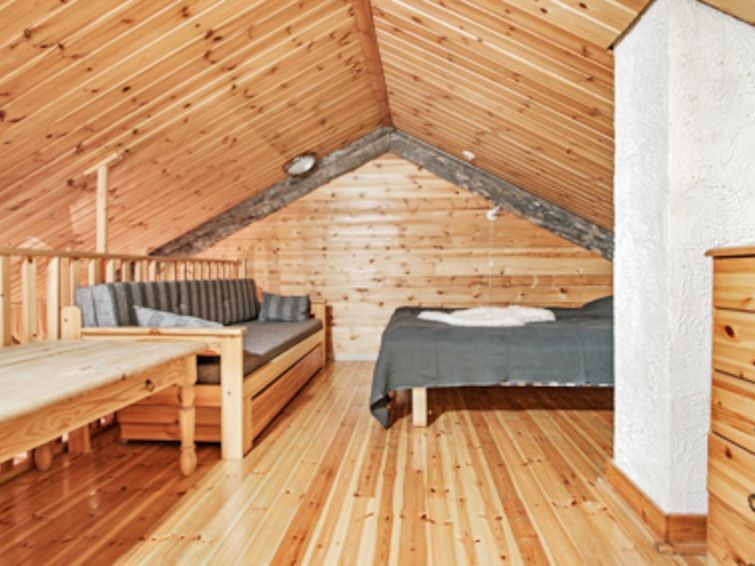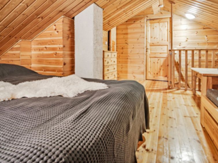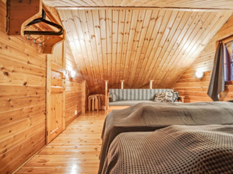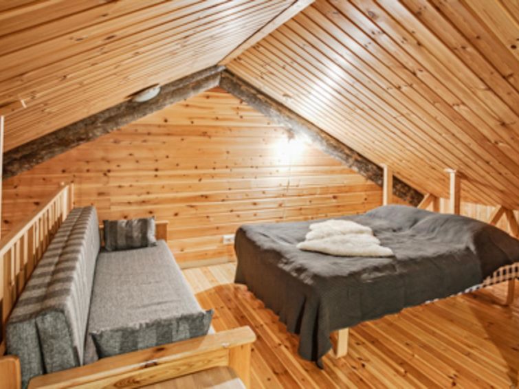 Downstairs: living room/kitchen, 1 x bedroom with 2x80 cm beds, toilet, washroom, sauna (electric stove) and fireplace.