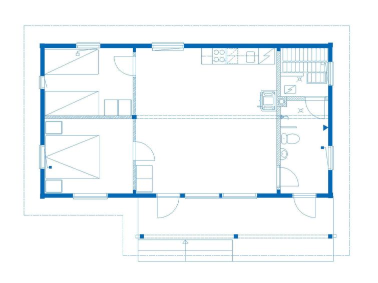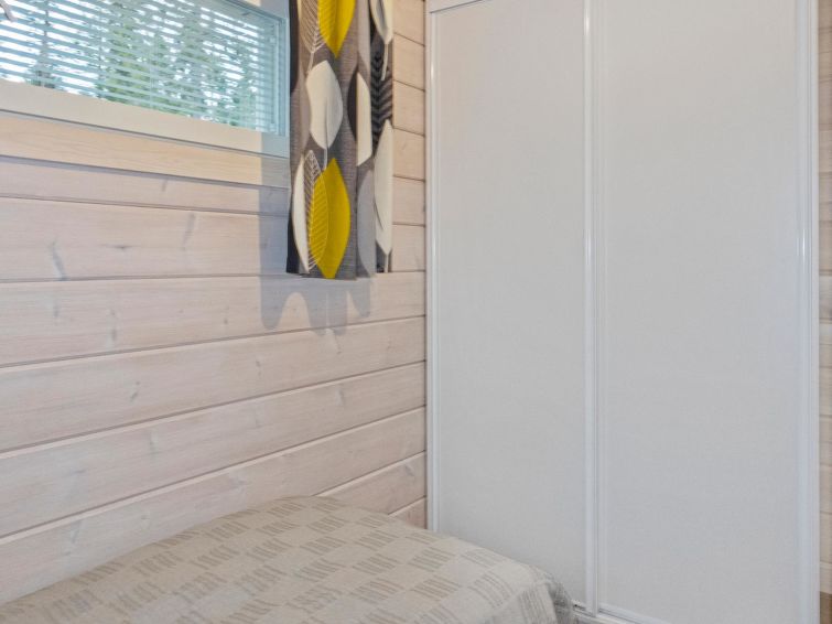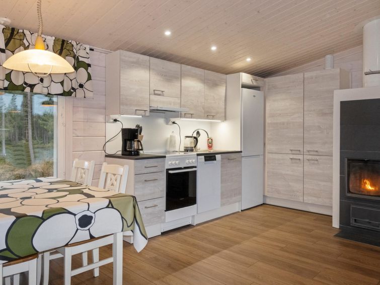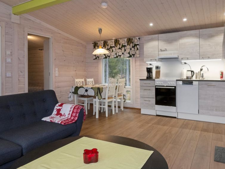 The cabin is built of planed logs, completed in 2022. Living room/kitchen, 2 bedrooms, both with 2 beds, sauna and washroom/WC.