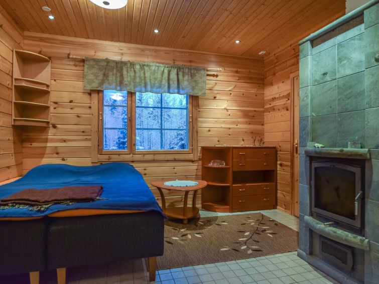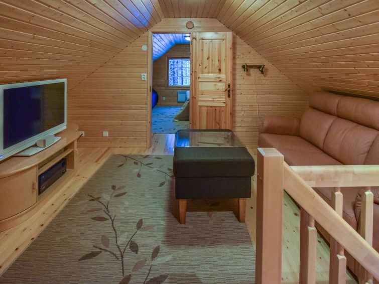 High quality log cabin built in 2012. Downstairs there is a living room-kitchen with sofa bed and TV, washroom, sauna (wood and electric stove), fireplace room with double bed, toilet. Upstairs bedroom with double bed, bedroom with double bed and single bed, and tv. Upstairs in the lounge there is sofa bed, TV and good sound equipment. All three televisions display satellite channels.
