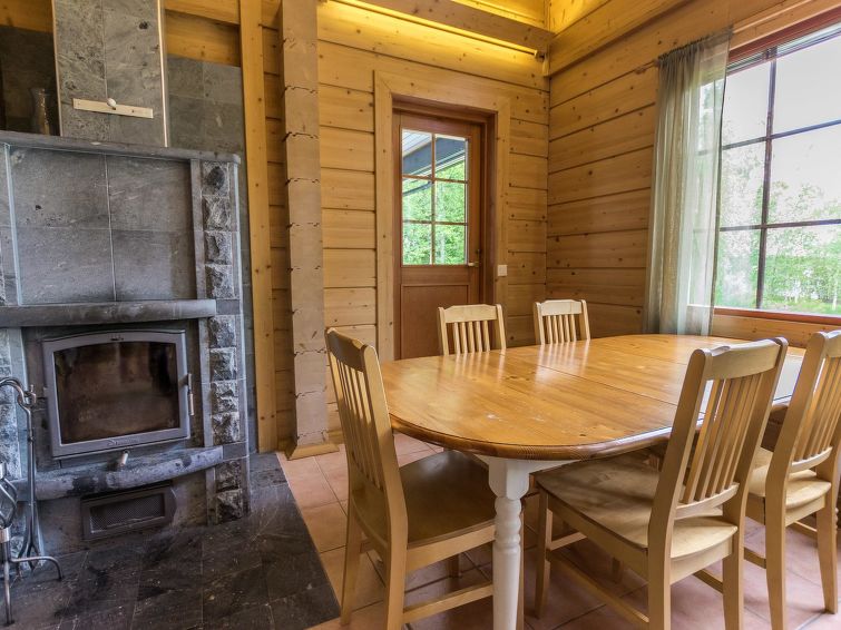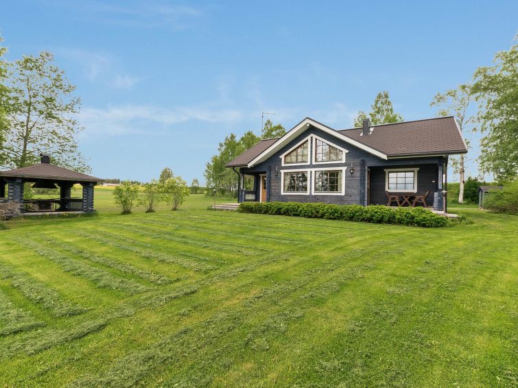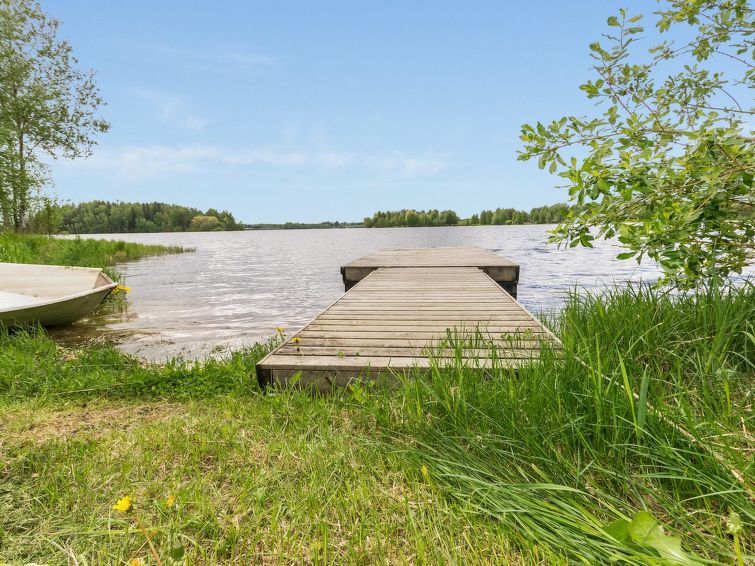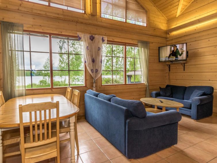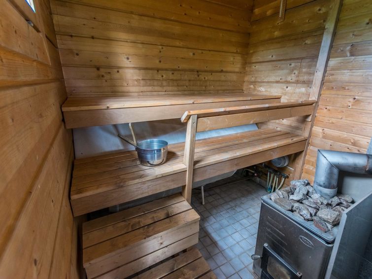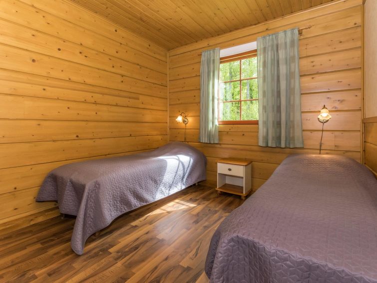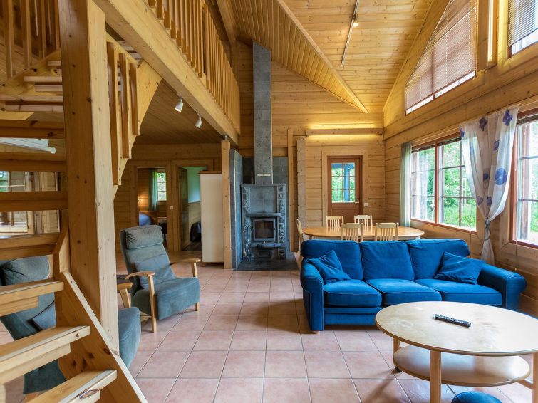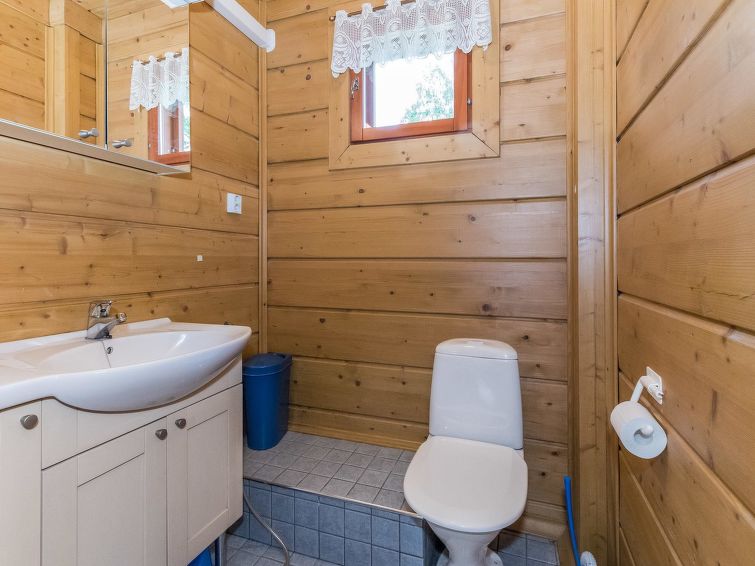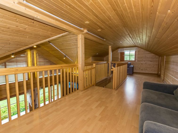 Log building 2004, living room/ kitchen, downstairs 2 bedrooms 2 beds in each, upstairs bedroom 2 beds and loft convertible sofa/bed, washroom, dressing room, sauna, 2 x open porch. Air source heat pump. High standard, well decorated and furnished cottage, suitable for 2 families even. Yard area level, sunny and mainly grassy. Life jackets on request.