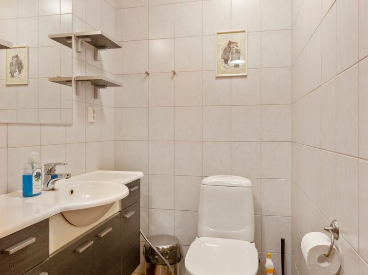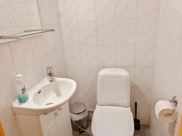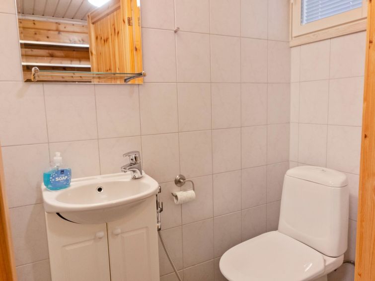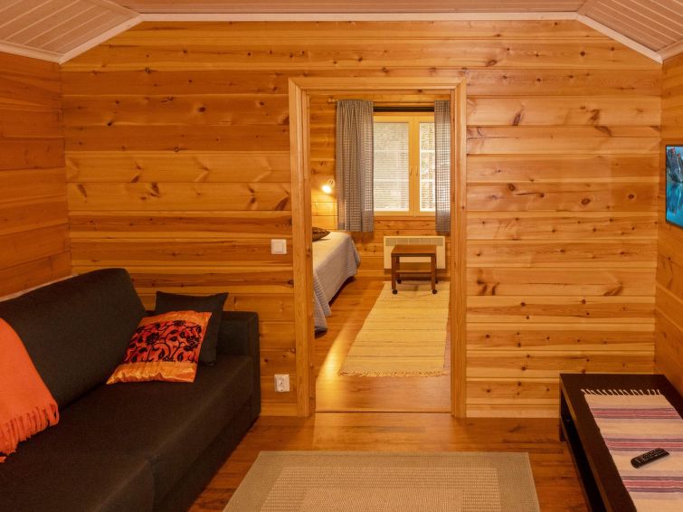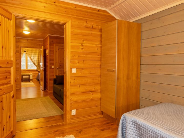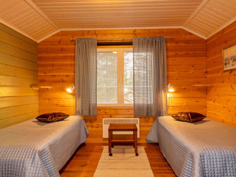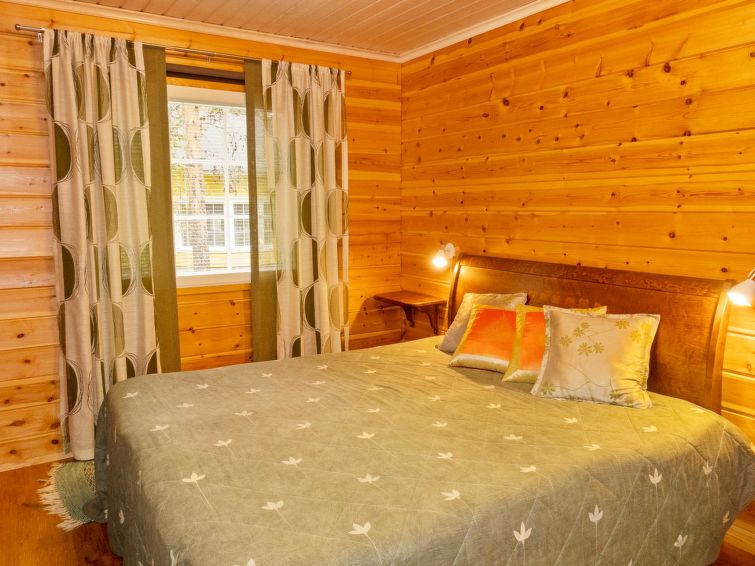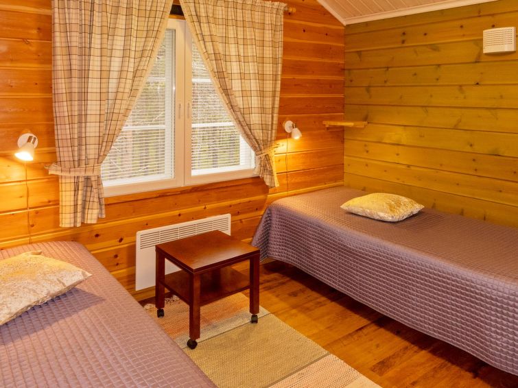 Log cabin on two floors, built in 2007. Ground floor: living room/kitchen, bedroom with double bed, second bedroom with two single beds (width of one of them 120 cm ), electric sauna, washroom 2 showers, dressing room / utility room, downstairs 2 separate toilets, third toilet upstairs, open porch. Upstairs: 2 bedrooms, each with 2 single beds, convertible sofa in the lounge area, toilet. In addition, two drop-down matresses.