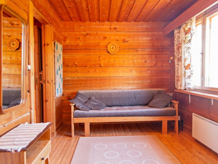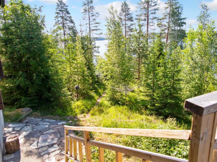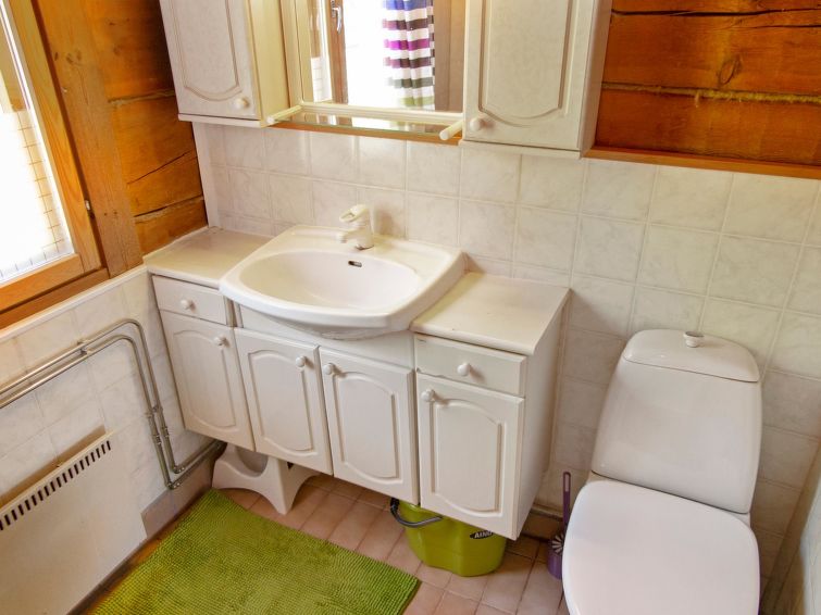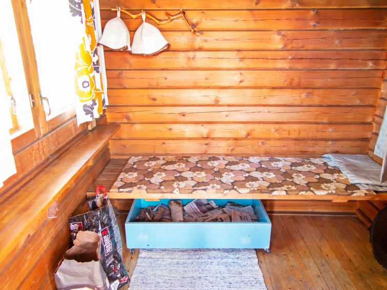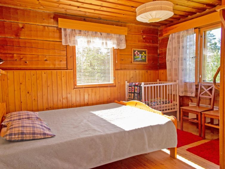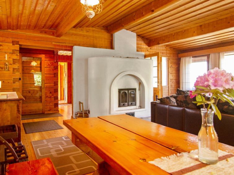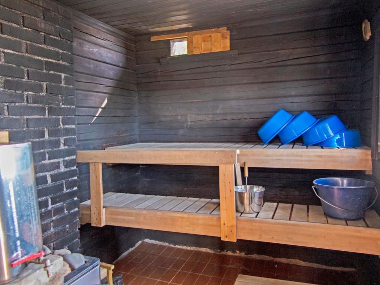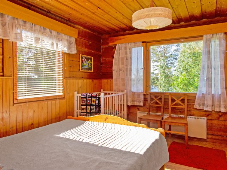 38 km east of Kuopio, lake Kuukkajärvi 30 m (length 3 km, breadth 1 km), shallow water, hard sanded stone bottom, own boat. Log building 1969, kitchen, living room convertible sofa, bedrooms with double bed, bed room with 2 convertible sofas, washroom, open veranda. Lakeside sauna (17 sqm), dressing room, electric light. The furnishings of the cottage is old-fashioned, but in this case it works. The plot is in natural state, from the cottage to the shore there is a steep slope and on the way to the sauna and the pier there is lighted path, which is partly rocky. The second path is flatter and leads to children's swimming area. Outdoor grill at shore, large pier for sunbathing and for adult swimming. Shallow water for kids nearby. Shore faces south, peaceful location. No view to the neighbour.