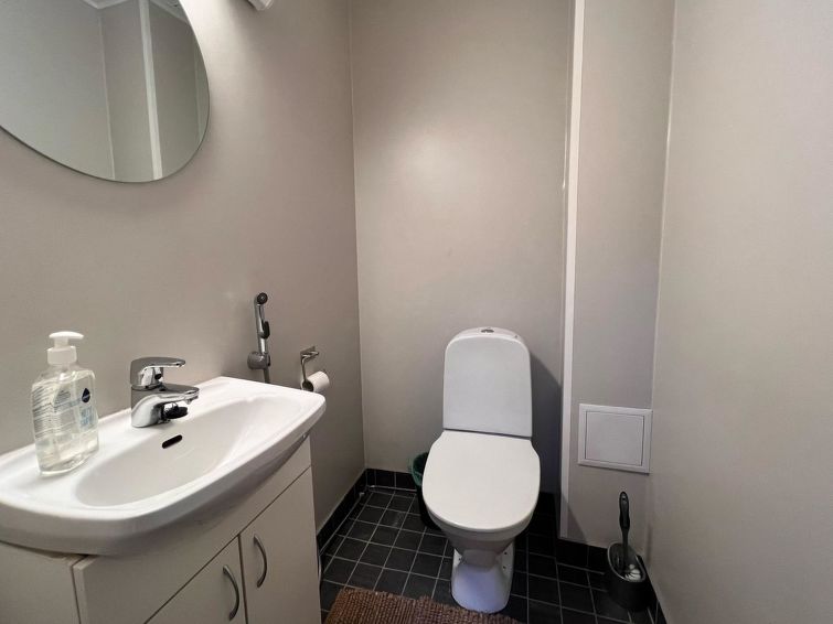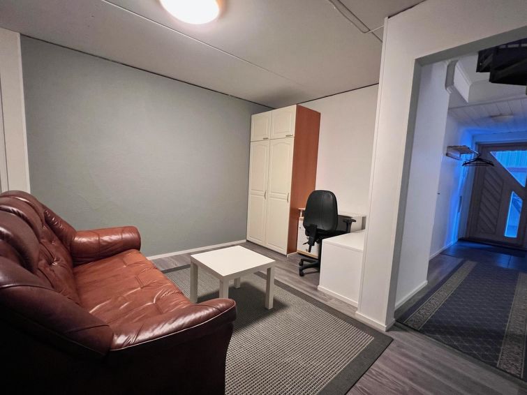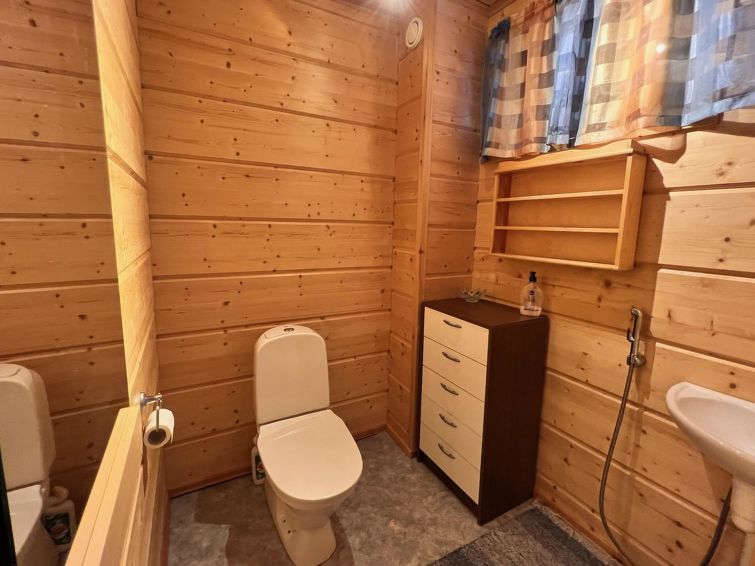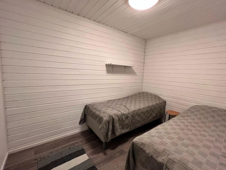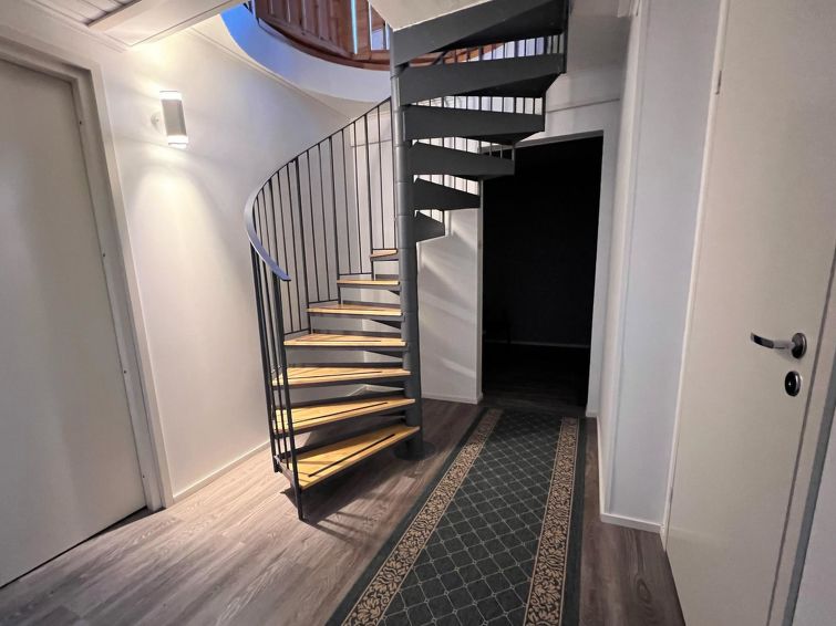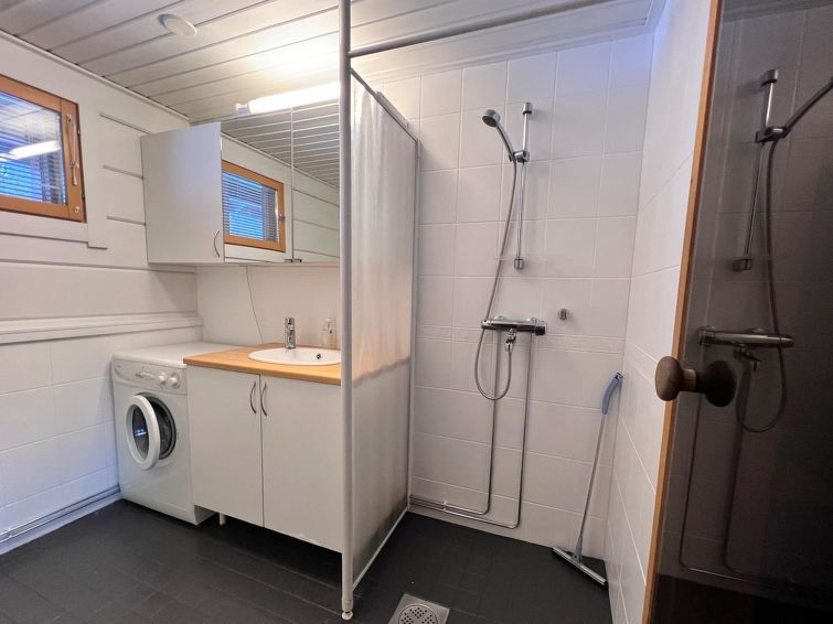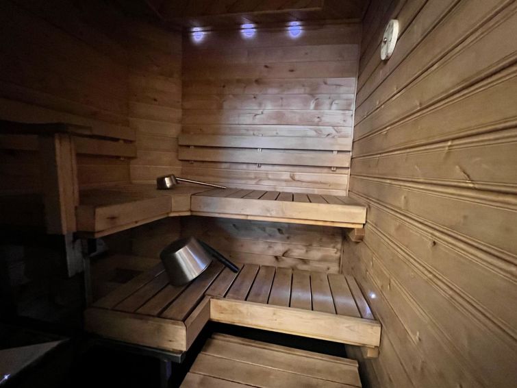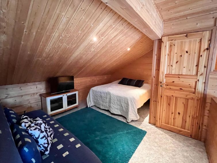 On the entrance floor, you'll find an open kitchen that is well-equipped for preparing your own meals. The living area has a spreadable sofa bed. This floor also features one bedroom with a double bed. Sauna compartments are also located on this floor, allowing you to relax and warm up after a day of activities. The washroom and WC are conveniently on the same floor.