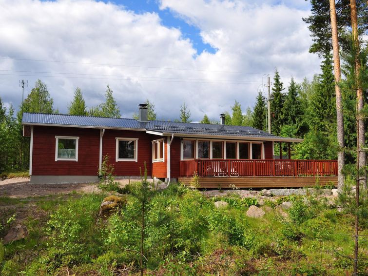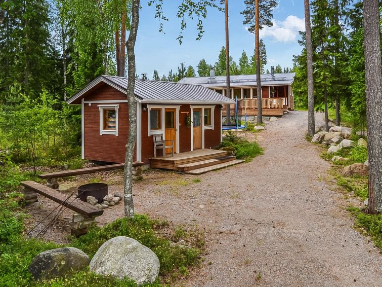 75 km north of Tampere, L.Kuusjärvi 40 m (length 4 km, width 0.5 km), shallow, hard sand and rock shore, own boat. Prefabricated board element building 2001, renovated 2014, living room/kitchen convertible sofa, bedroom separate bed for two, bedroom separate beds for two and couch, sauna (electric/access via porch), 2 x shower room and 2 x toilet. Dressing room. Outbuilding with two separate beds, electric heating. Terrace has gas-fired barbecue grill.