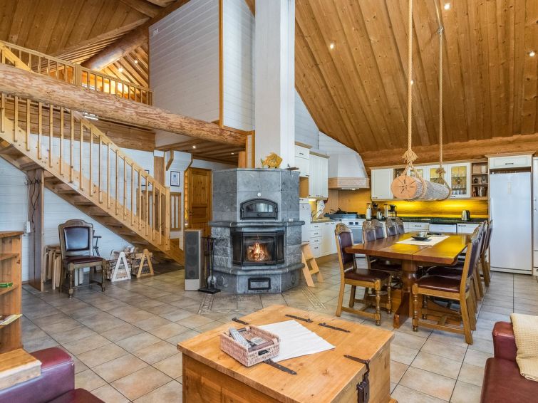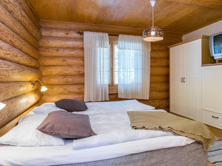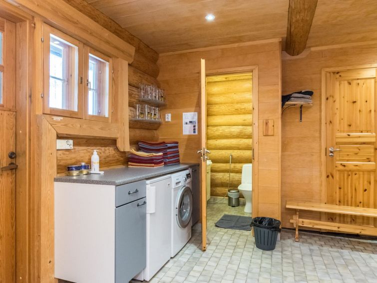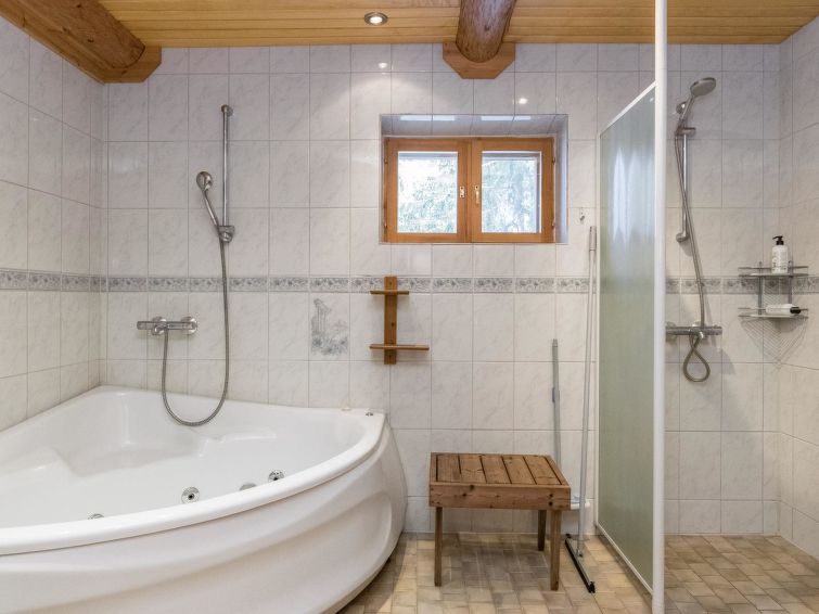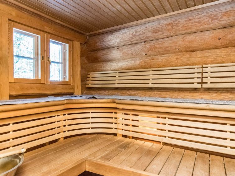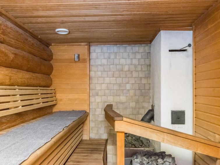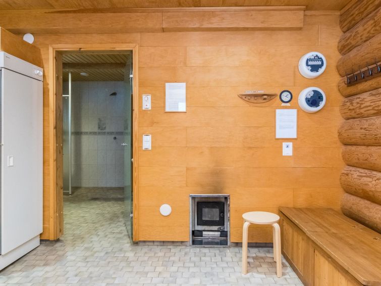 The ground floor living room/kitchen has a space for cooking and spending time together. The well-equipped kitchen also has a wine cabinet where you can keep your drinks cool. Two bedrooms, each with two beds, guarantee a peaceful night's sleep. Both bedrooms also have a TV and DVD player. The bathroom has a lovely hydro massage bath, two showers and even a cold waterfall. In the sauna, you can relax in the heat of both the wood and electric sauna stove. There is plenty of space to move around and get dressed in the dressing room and WC.
