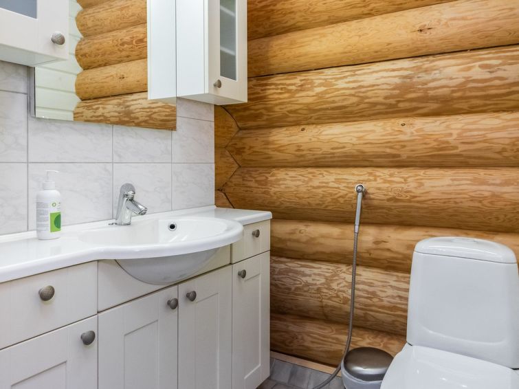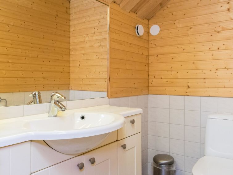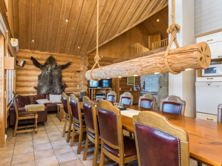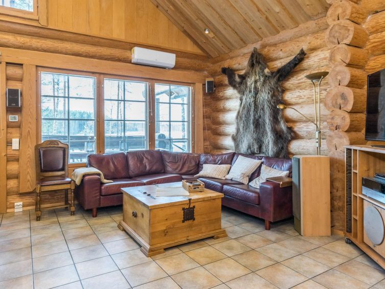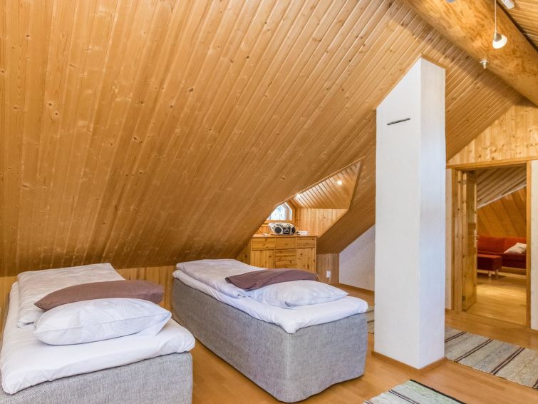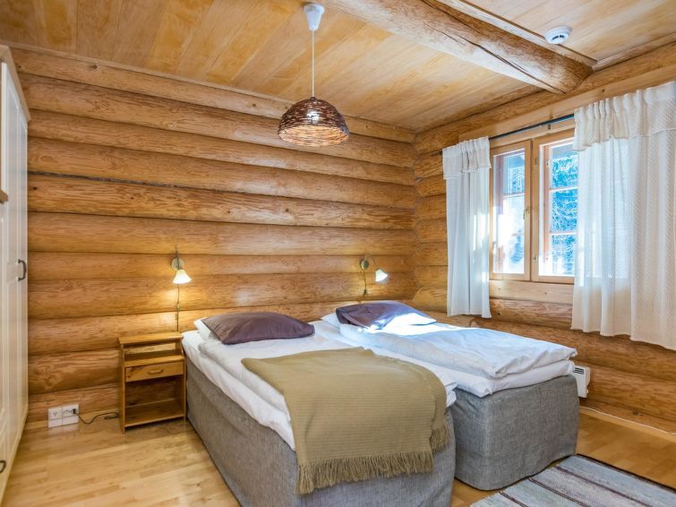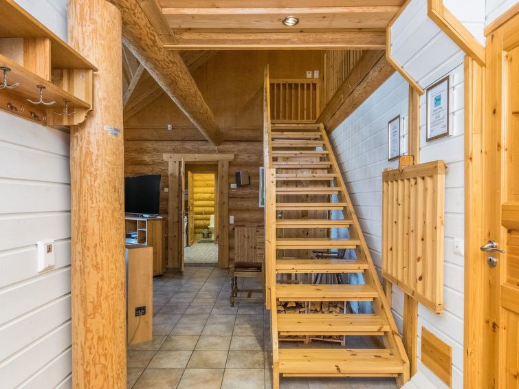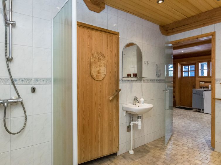 The ground floor living room/kitchen has a space for cooking and spending time together. The well-equipped kitchen also has a wine cabinet where you can keep your drinks cool. Two bedrooms, each with two beds, guarantee a peaceful night's sleep. Both bedrooms also have a TV and DVD player. The bathroom has a lovely hydro massage bath, two showers and even a cold waterfall. In the sauna, you can relax in the heat of both the wood and electric sauna stove. There is plenty of space to move around and get dressed in the dressing room and WC.