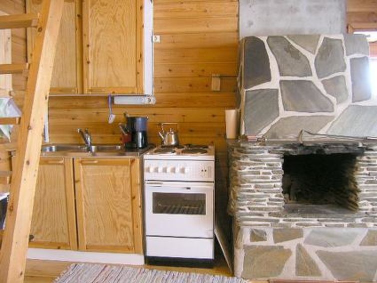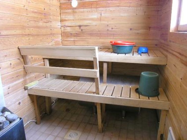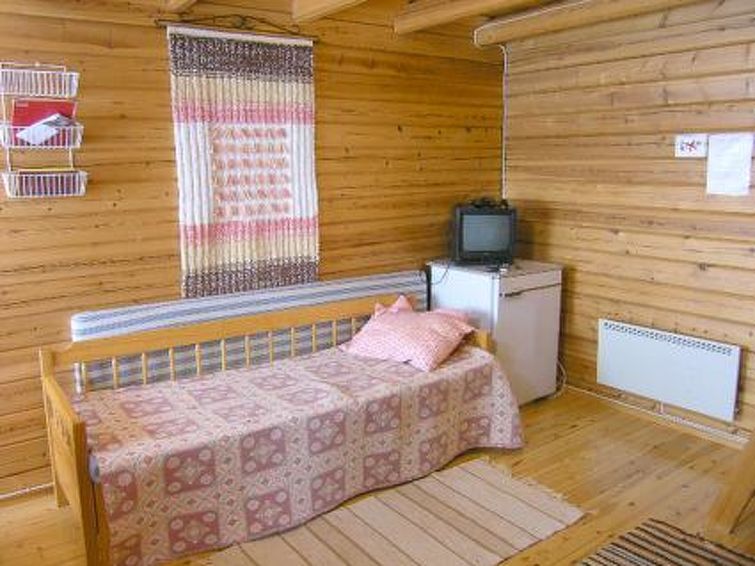 Log cabin, built in 1988, livingroom with bunk for one, four mattresses on the loft (steep stairs to loft, max. height of 1.35 m), sauna with electric stove, bathroom, separate toilet, small covered porch. Cottage is situated in holiday village, area of natural beauty. Also caravans in the area. Campfire site by shore. Hiking path. Cottage owner has private Lumbering and log floating museum, small entrance fee.