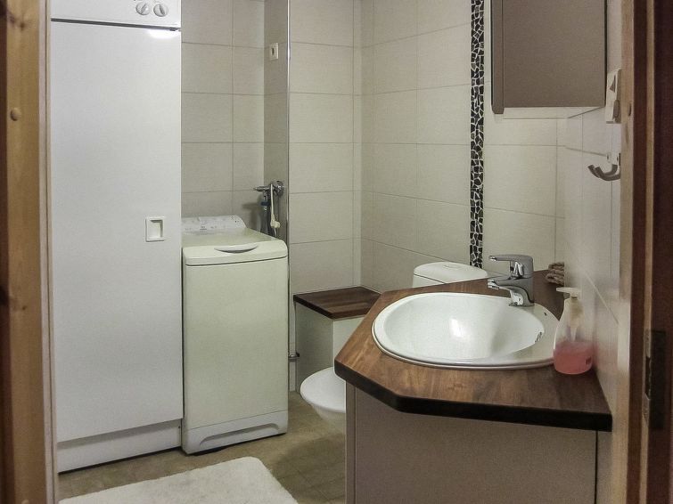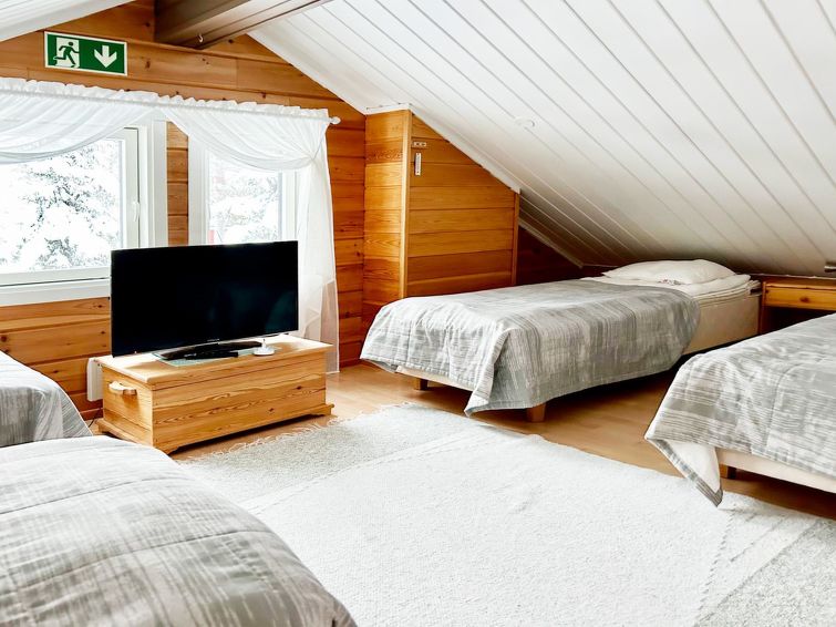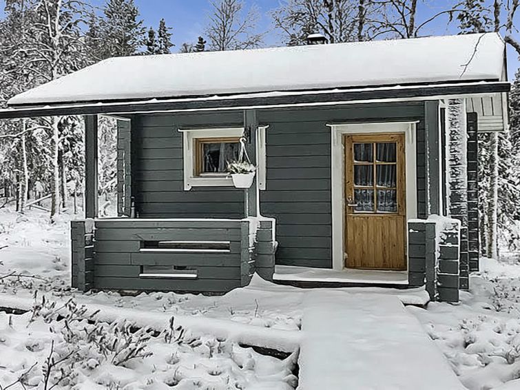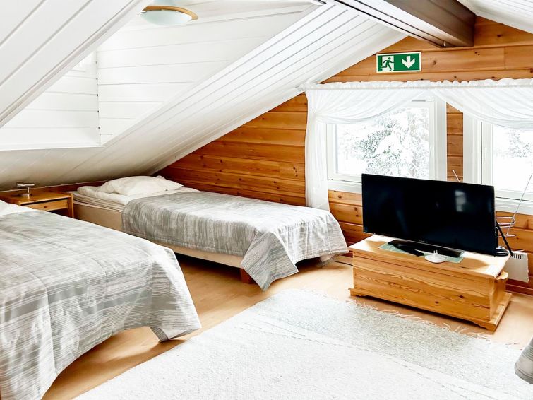 25km north of Kuusamo, Ruka 7km, Lake Pyhäjärvi 20m, shallow sandy bottom beach, pier, own boat. Log-panelled cottage, built in 2002, bedroom (folding door): 2 beds, loft (sloping ceilings, max height 180 cm) 4 beds. Living room with convertible sofa (please note; maximum amount of guests is 6). Combined kitchen/living room, electric sauna. Internet (Wi-Fi). Cottage situated on Lake Pyhäjärvi. Mixed forest in the vicinity.