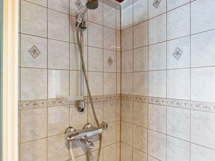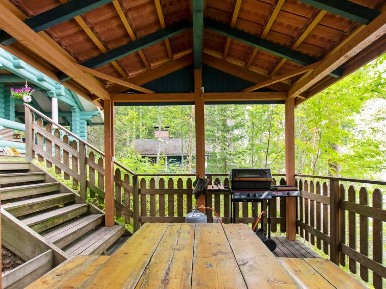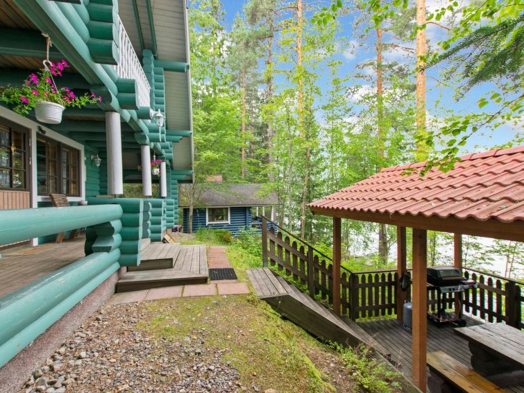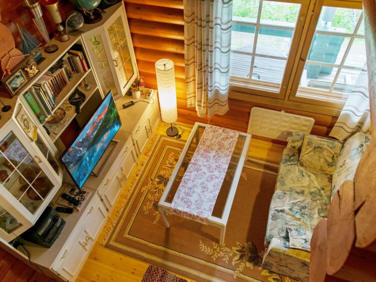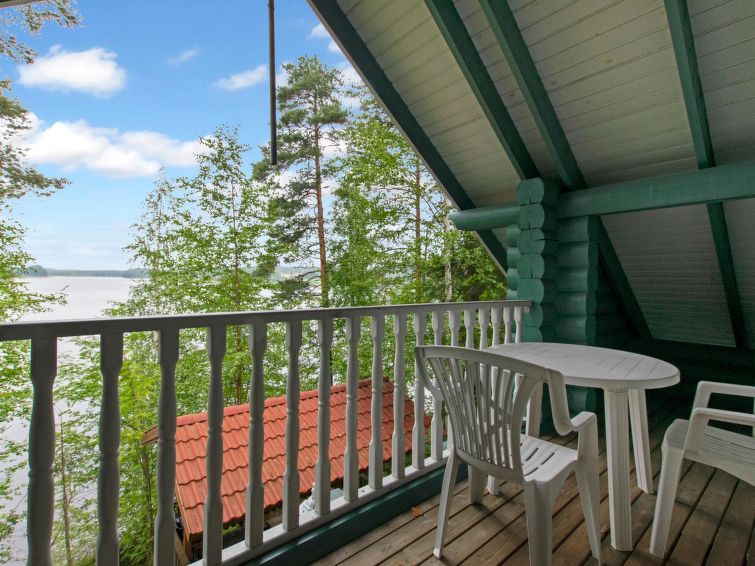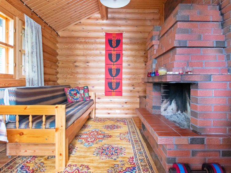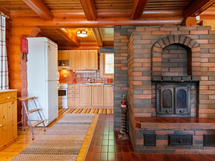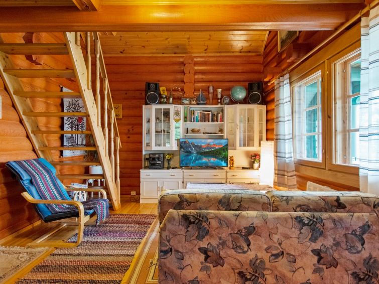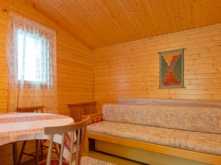 Log chalet 2000, living room/kitchen extra double bed, washroom with WC, roofed terrace on 3 sides. In upstairs there are lounge area, balcony and double bed. Cottage is made of half-round logs and tastefully painted. In kitchen a wood-burning stove with an oven is a useful extra.