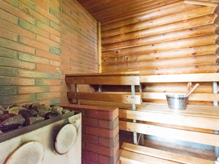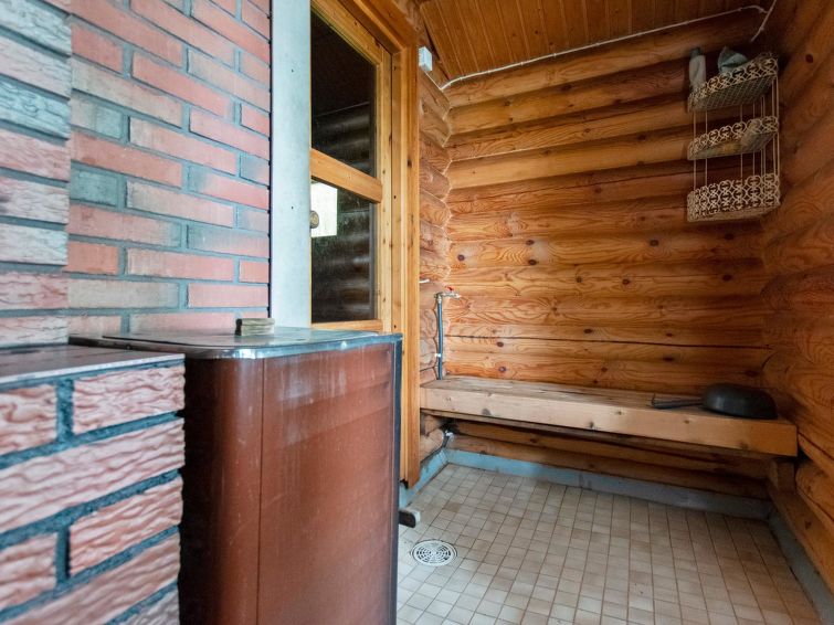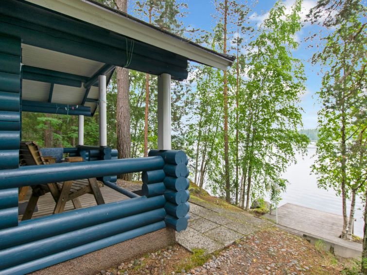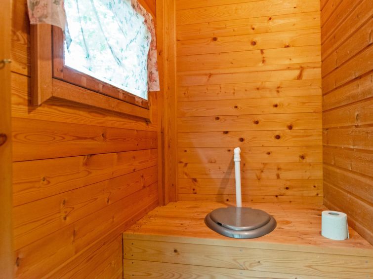 Yard building in summer use with access to an EKO toilet via a terrace. Lakeshore sauna 30 m², washroom with cold water pipe and wood-burning stove with hot water cauldron. Sauna rest room with extendible double bed, steps from terrace down to jetty.