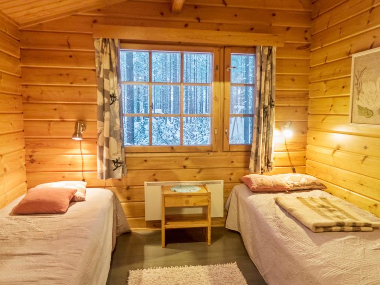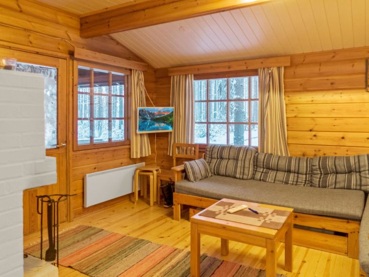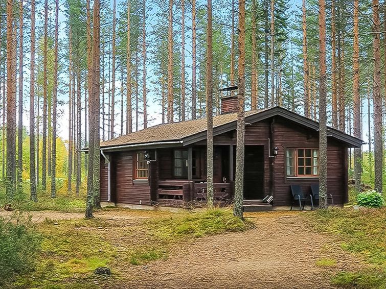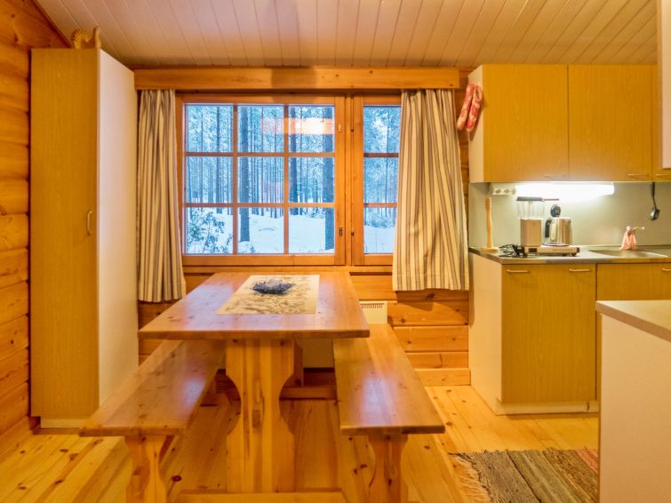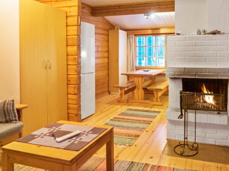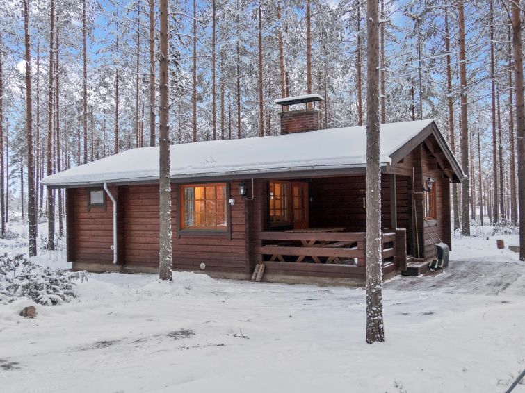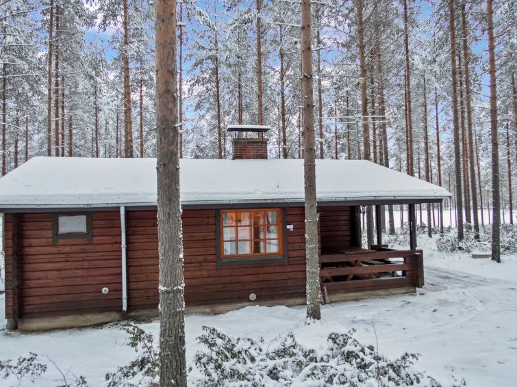 This log cottage by the Lake Pikku-Valkeinen in Välikoski area in Sotkamo was completed in 1993. Floor area 57 m². Kitchen, living room with beds for three, bedroom with separate beds for two. Sauna (electric heating), washroom, separate toilet.