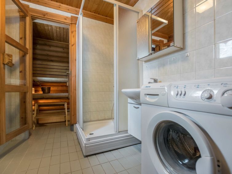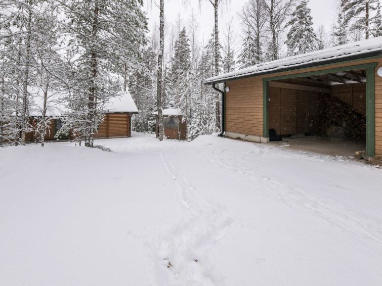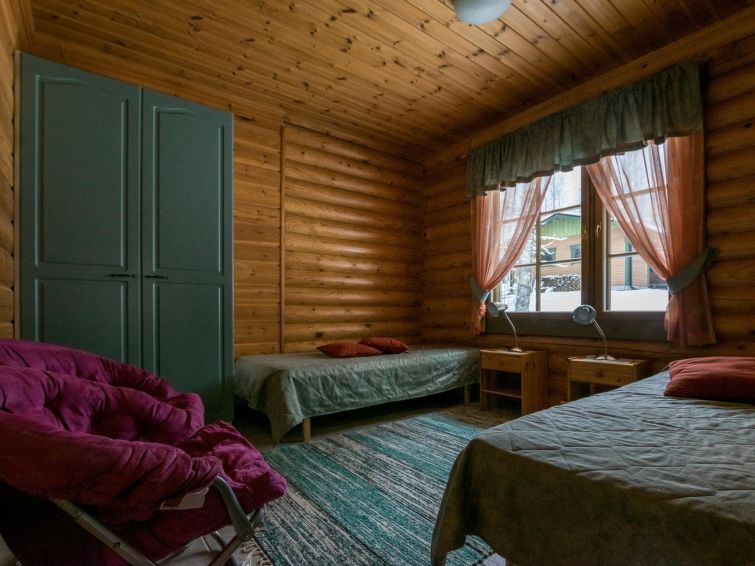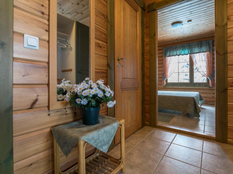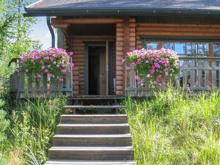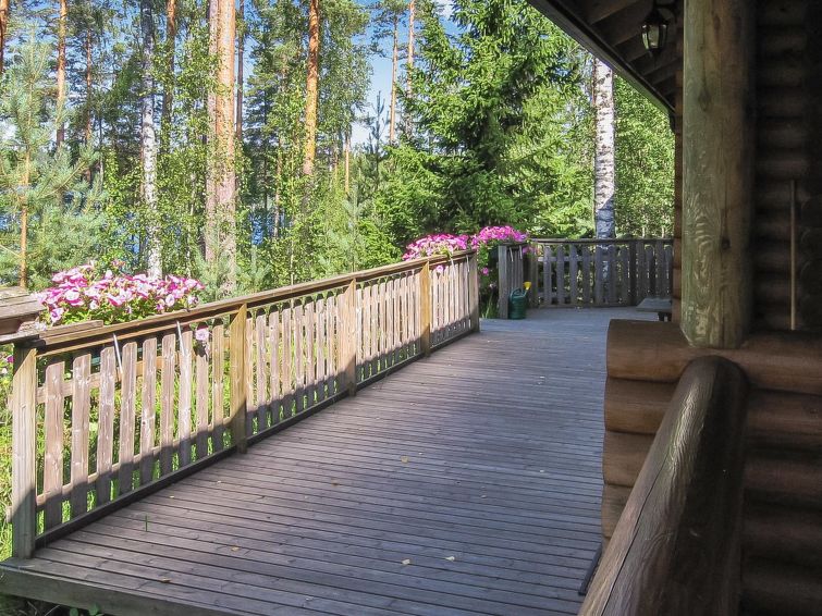 55 km west of Jyväskylä, lake Asunnanjärvi 40 m (length 3 km, width 800 m), shallow, hard sanded bottom, own boat. Log building 2001, living room/ kitchen 2 extra beds, 2 bedrooms each with 2 beds, dressing room, washroom, sauna (electric sauna stove), 2 x open porch. Horse riding 4 km. From cottage gentle slope down to shore, shore faces west, an evening sunlight spot.
