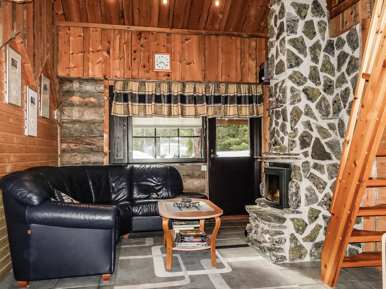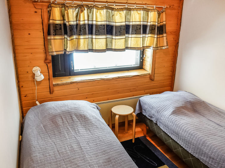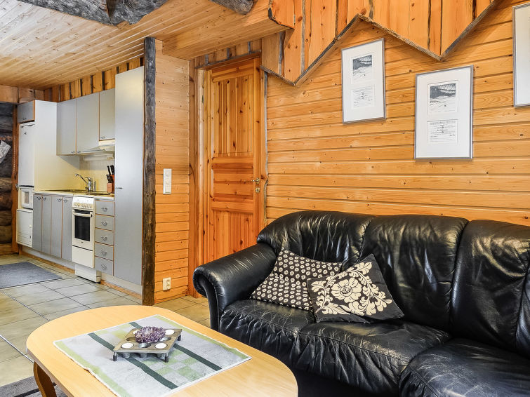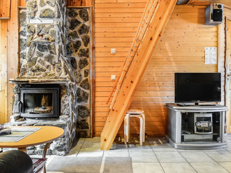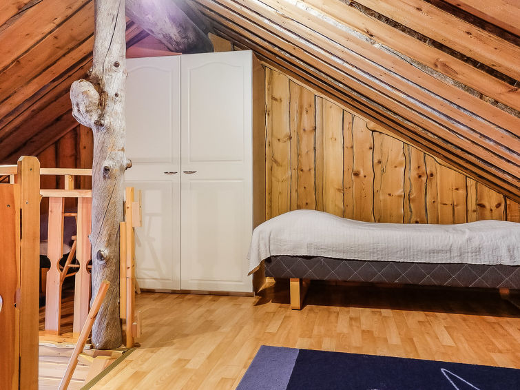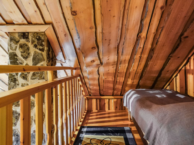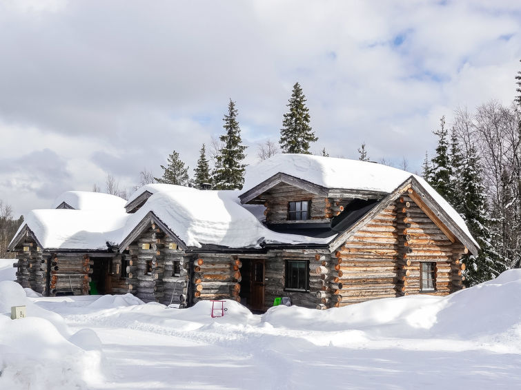 116 km north of Rovaniemi, silverlog apartment in Luosto, built in 2002. Kitchen-living room, bedroom with 2 beds, upstairs bedroom with 2 beds, a loft with two beds, a steep staircase to the loft, sauna (electric stove), bathroom, terrace.