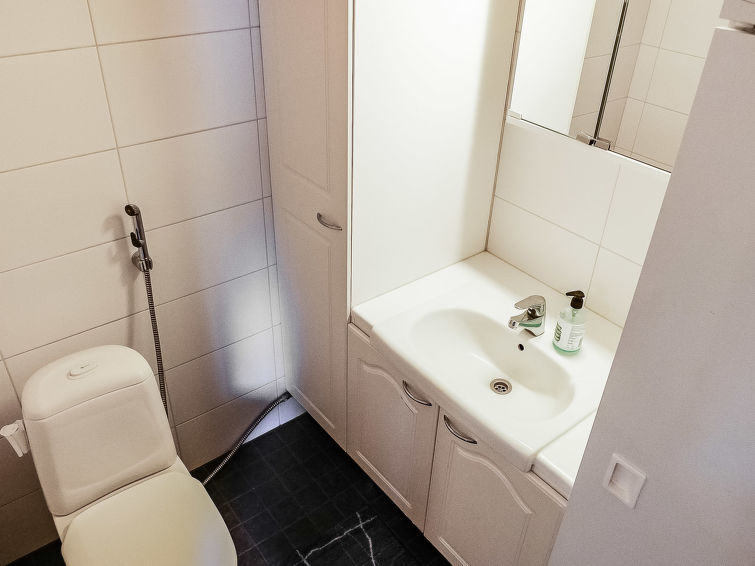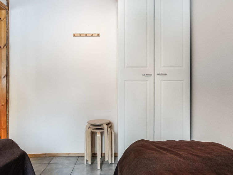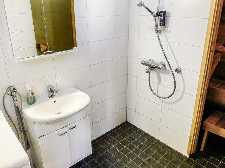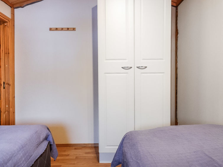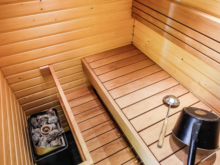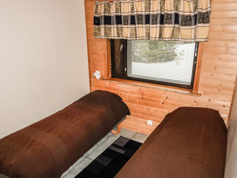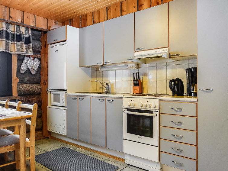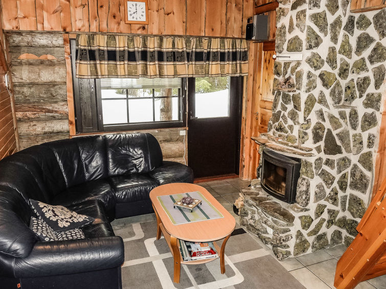 116 km north of Rovaniemi, silverlog apartment in Luosto, built in 2002. Kitchen-living room, bedroom with 2 beds, upstairs bedroom with 2 beds, a loft with two beds, a steep staircase to the loft, sauna (electric stove), bathroom, terrace.