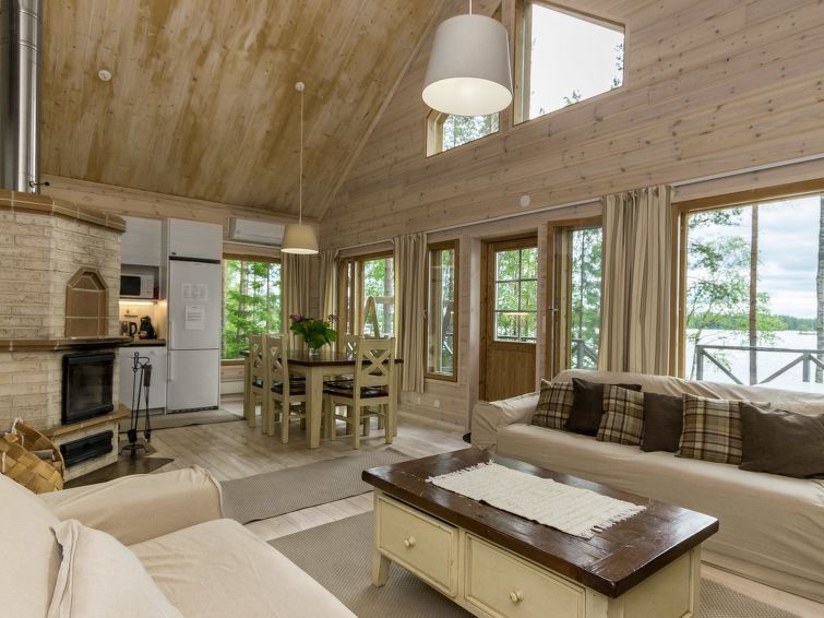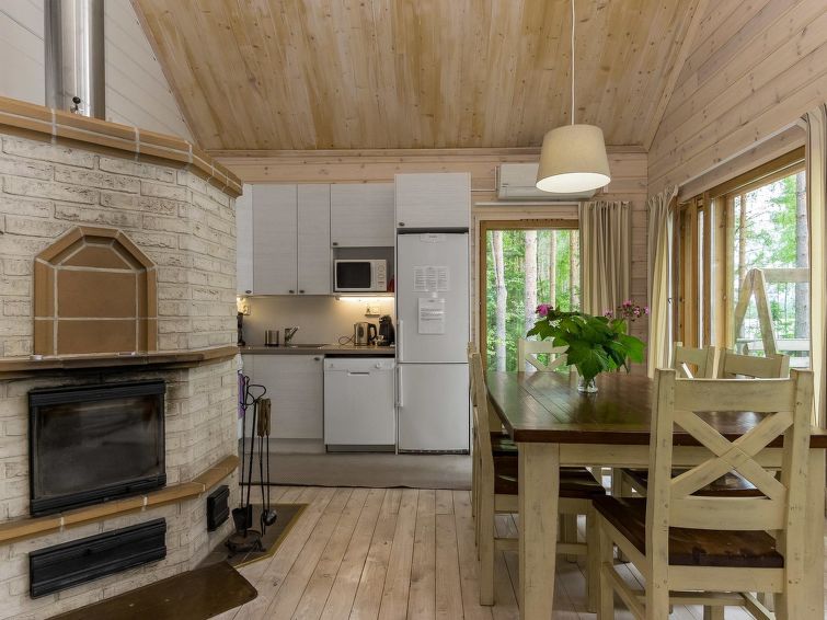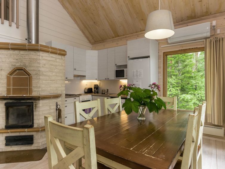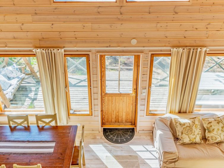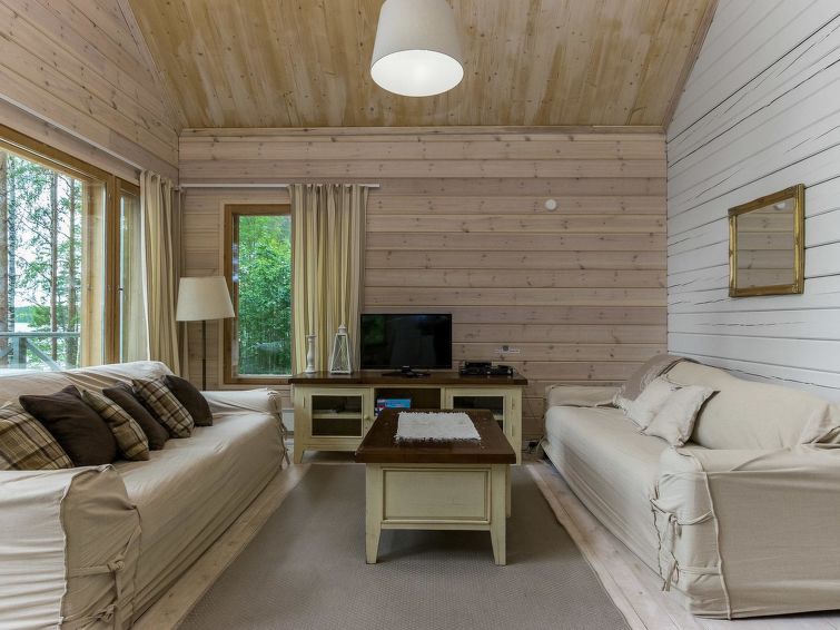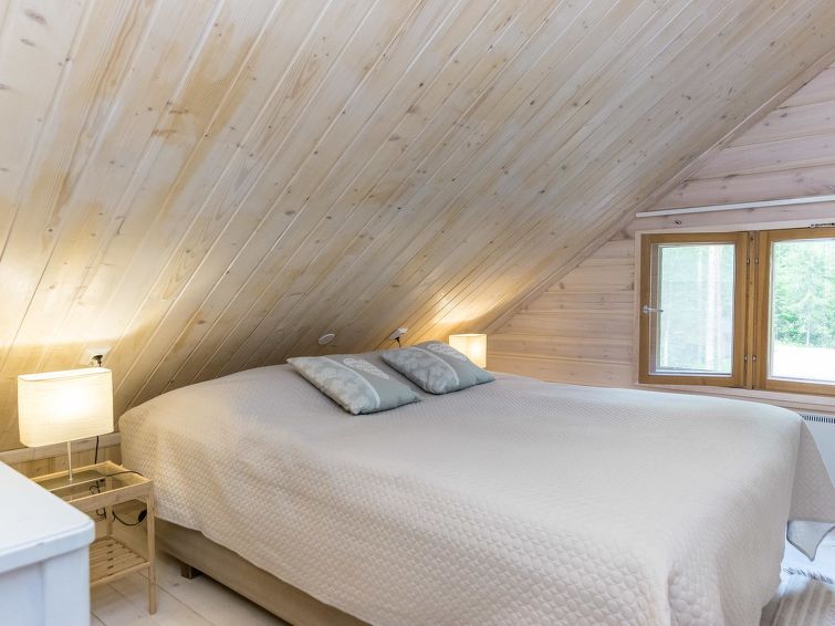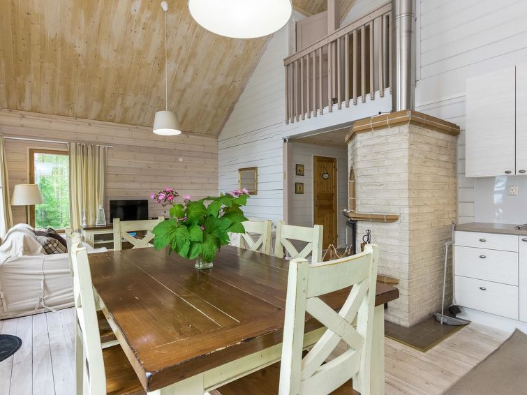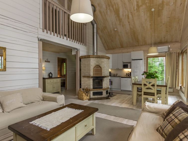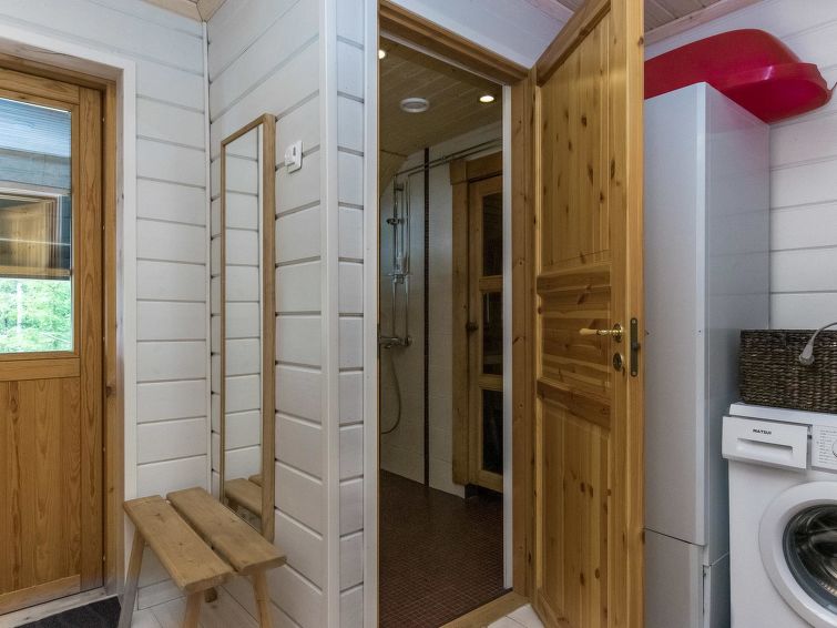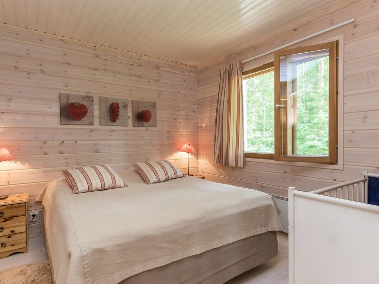 Log villa 2007, renovated in 2017, two extra beds in living room on sofa bed, kitchen, bedroom (10 m²) with double bed, utility room/dressing room, washroom, sauna (both wood burning and electric sauna stoves), separate WC, open terrace. Air source heat pump, Wi-Fi.