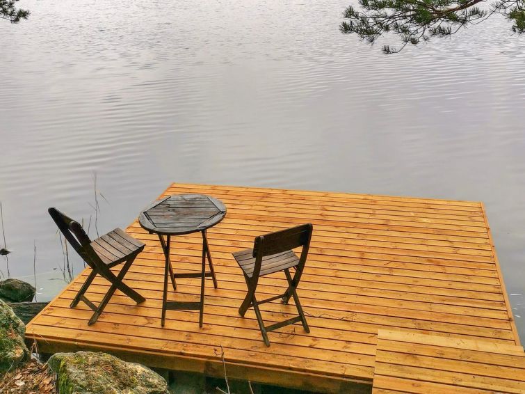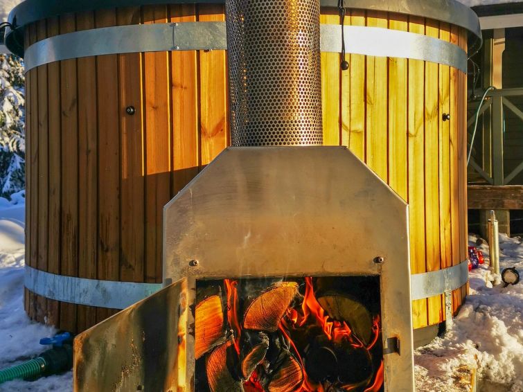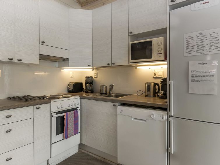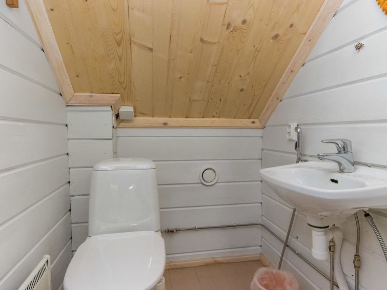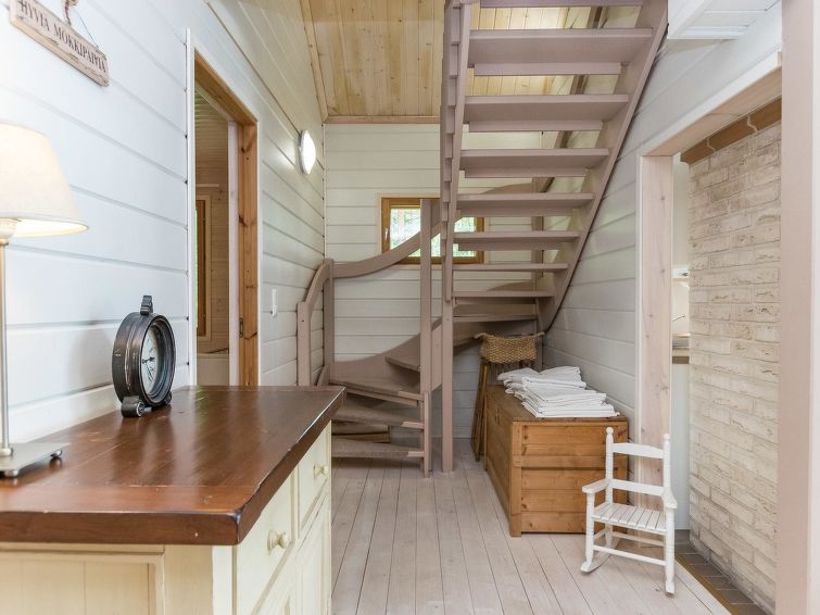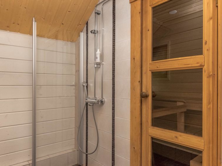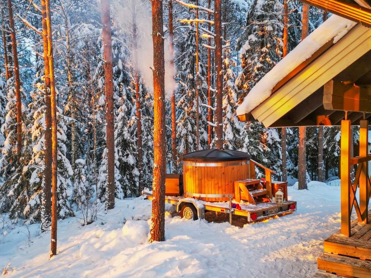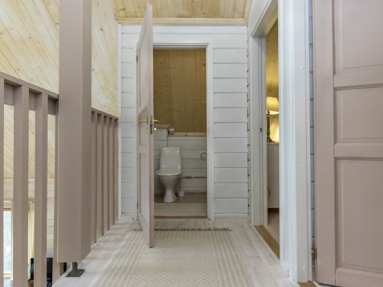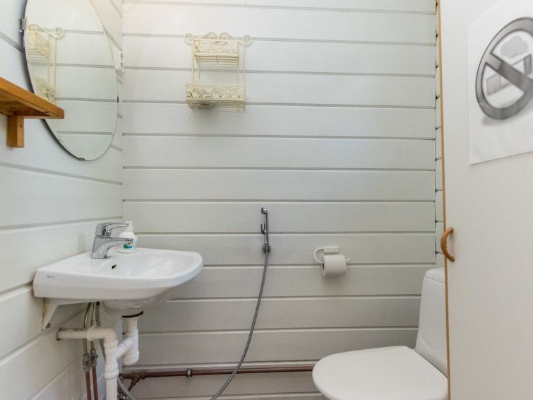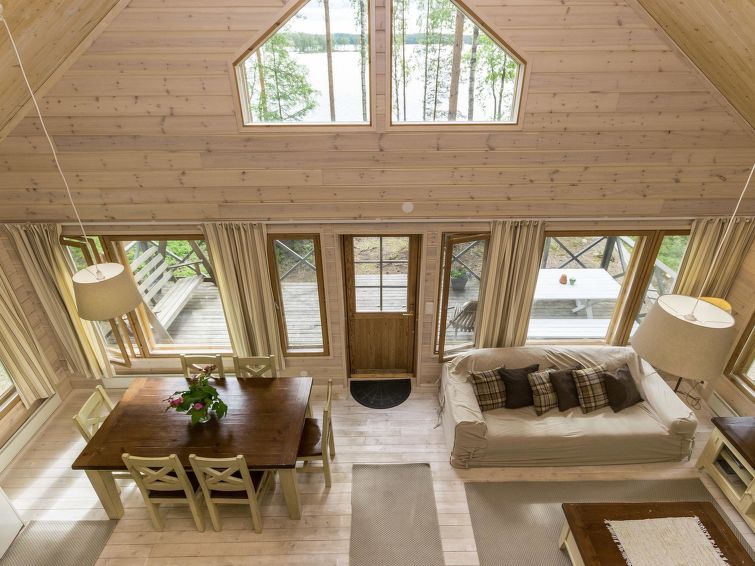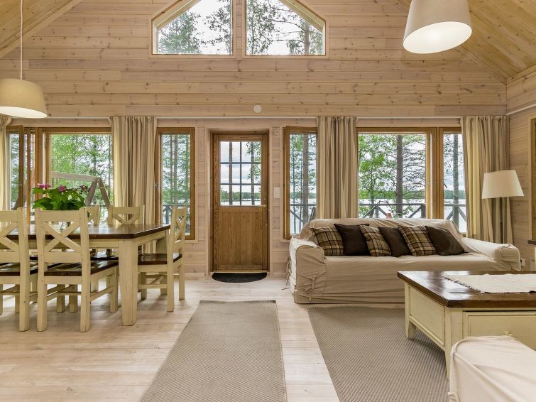 Log villa 2007, renovated in 2017, two extra beds in living room on sofa bed, kitchen, bedroom (10 m²) with double bed, utility room/dressing room, washroom, sauna (both wood burning and electric sauna stoves), separate WC, open terrace. Air source heat pump, Wi-Fi.