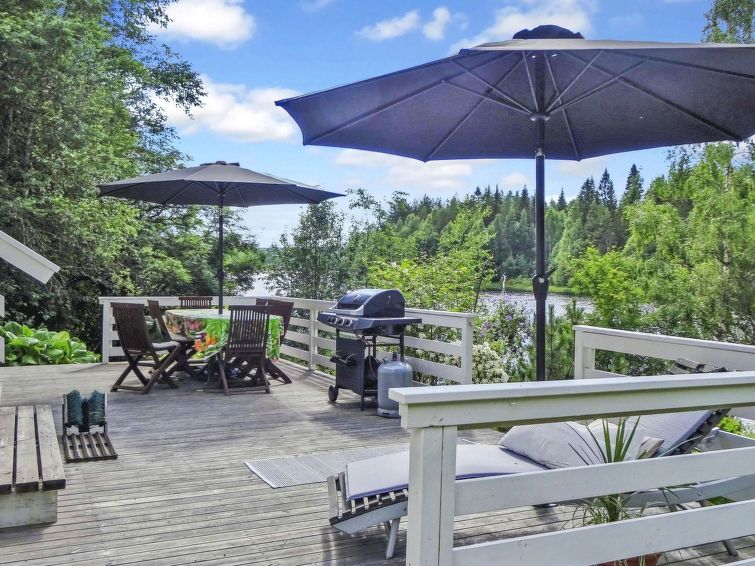 138 km north of Joensuu, 13 km north of Nurmes, River Ylikylä 15 m, shallow rock bottom, own beach and a boat. A log cottage built in 2008, kitchen-living room with convertible sofa (widht 110 cm when extended), a alcove without door with double bed, bathroom, wood-heated sauna, terrace.