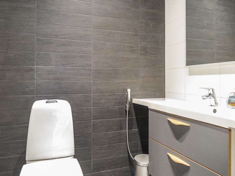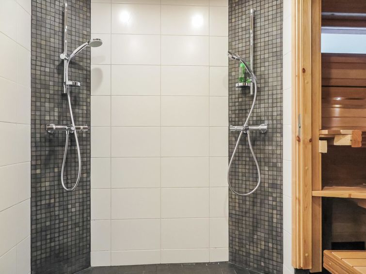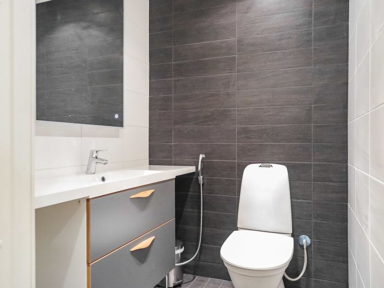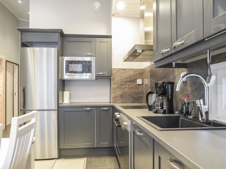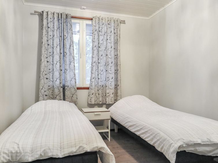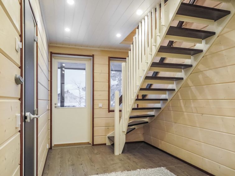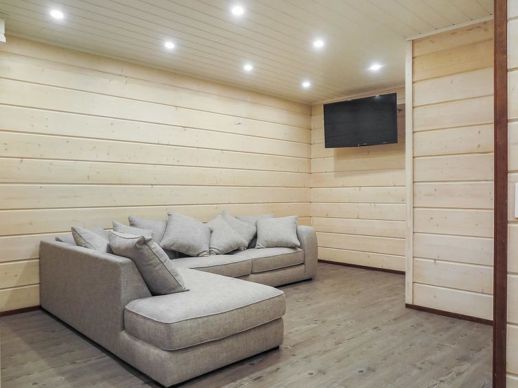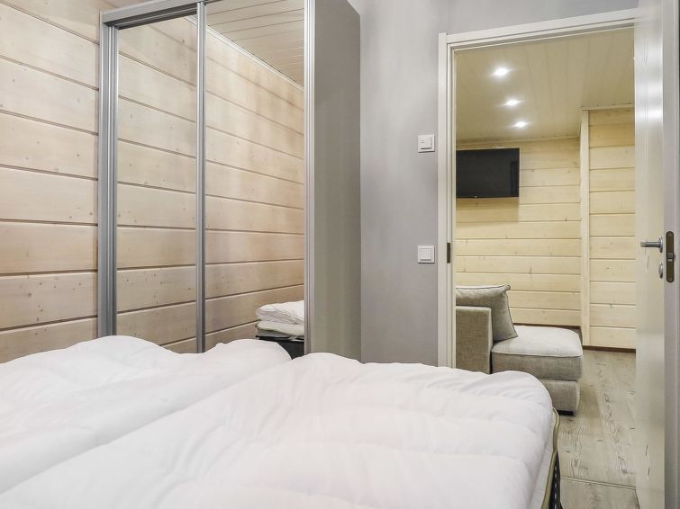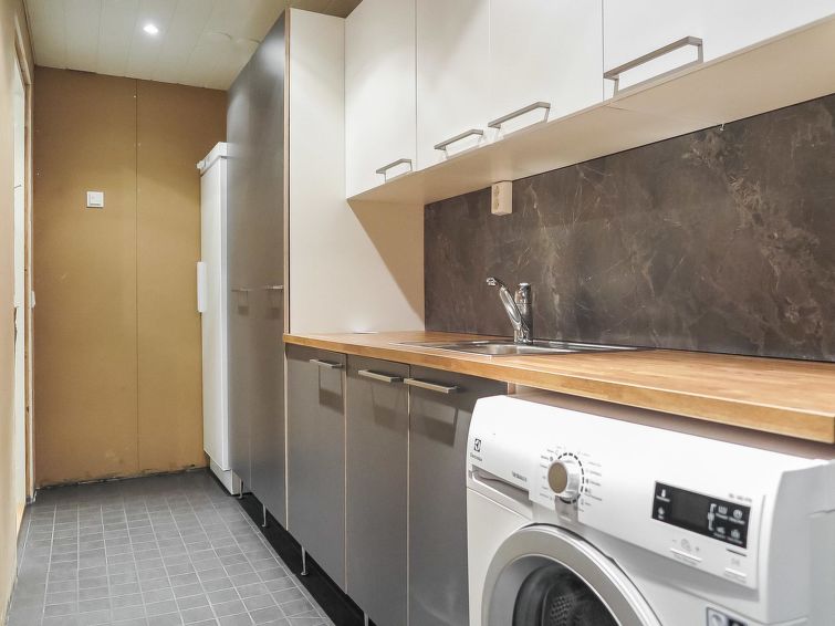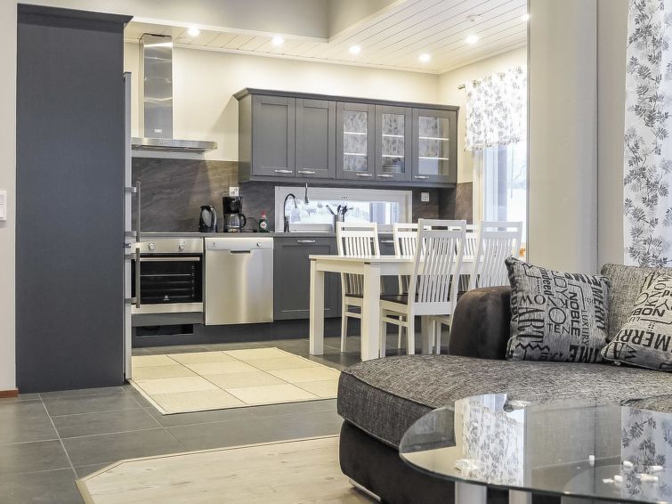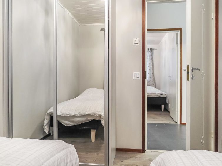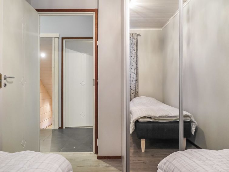 Wooden two-storey semi-detached house, built in 2016. The upper floor kitchen-living room, 2 bedrooms, each with 2 single beds, toilet and terrace. On the ground floor 1 bedroom with double bed, sauna(eletric), washhroom, toilet, utility room and living room. Sofa in living room is extra bed.