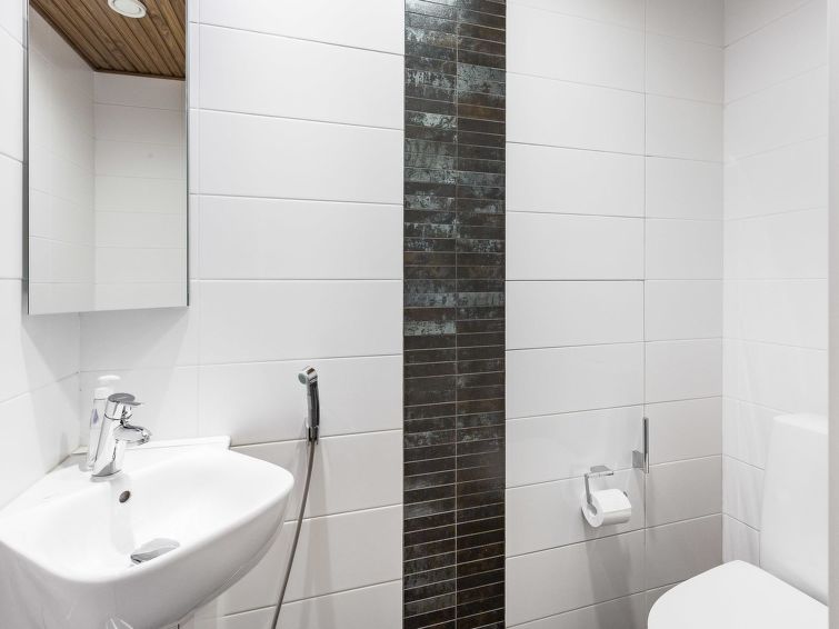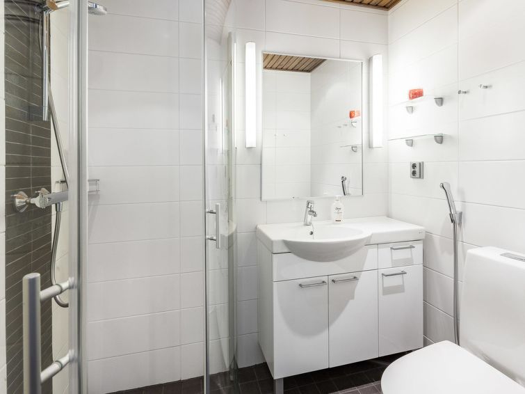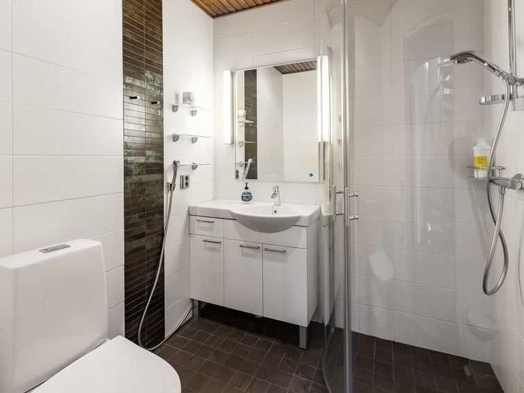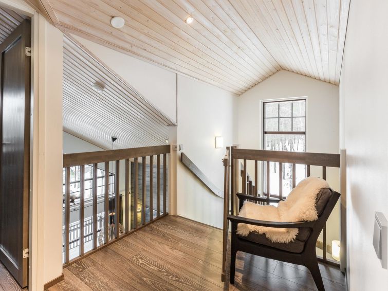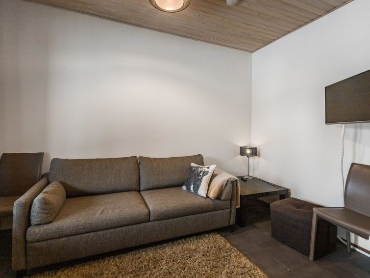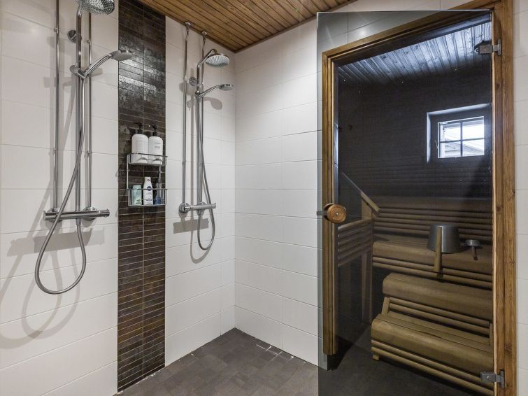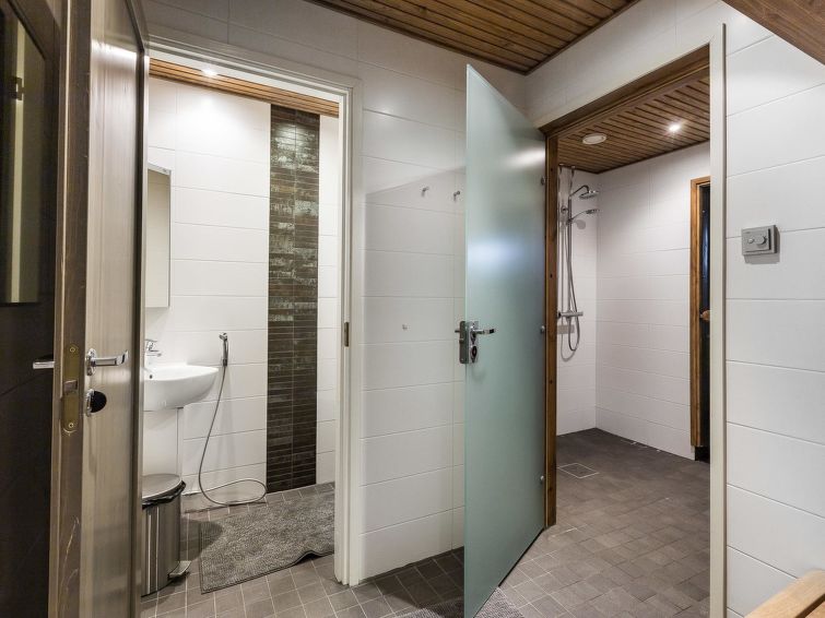 Downstairs you can relax after the sauna. There is a toilet in the dressing room. There is also a spacious utility room on the same floor and an extra room with sofa that could be spread out as a bed for one.